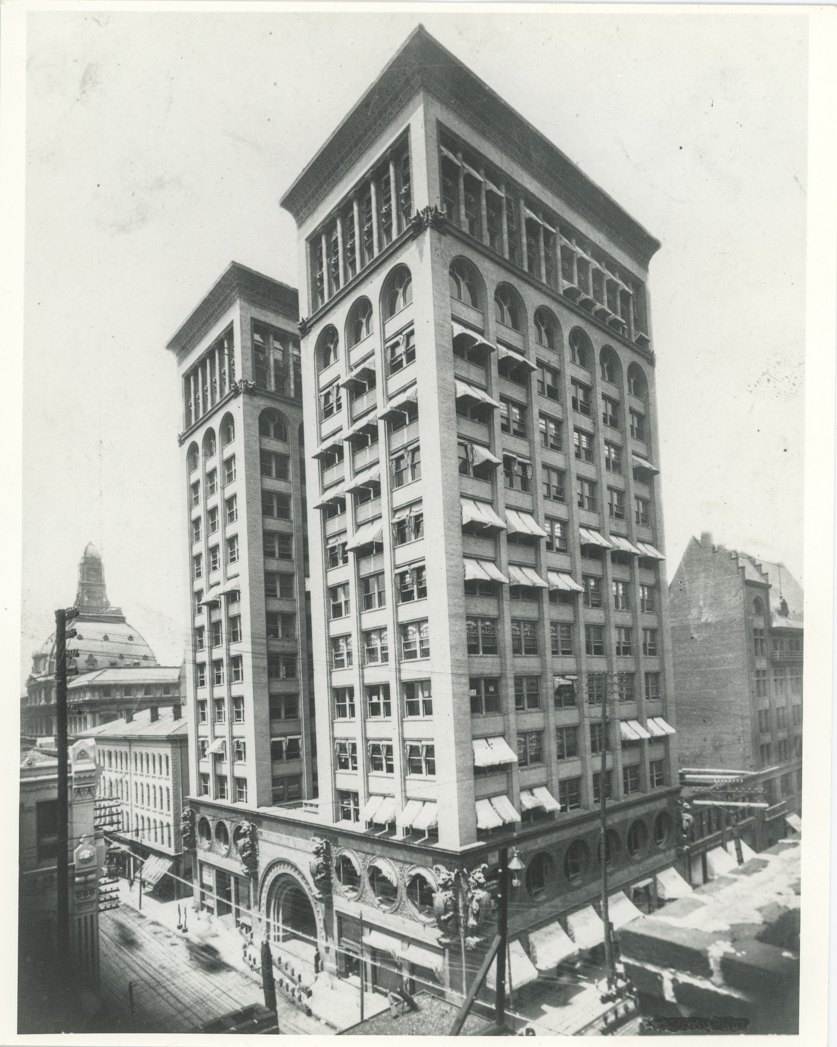 sadly, the olive street entrance, with buff-colored terra cotta expansive arch, large circular windows, and giant heraldic lions with monogrammed and dated shields, were removed (destroyed) sometime between 1924-1929.