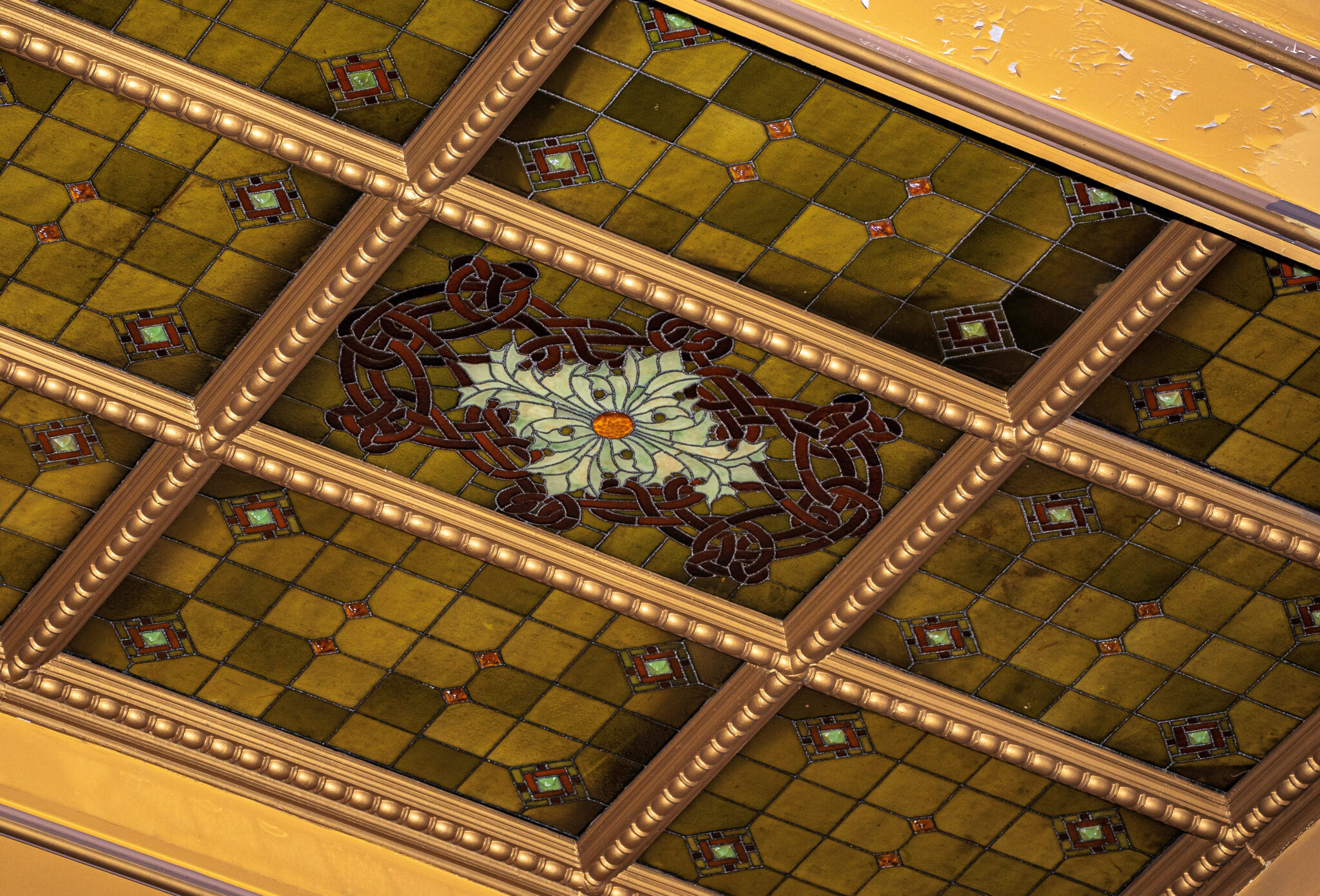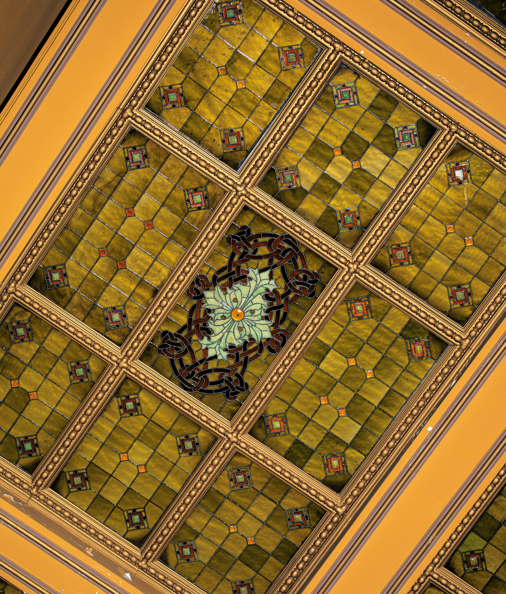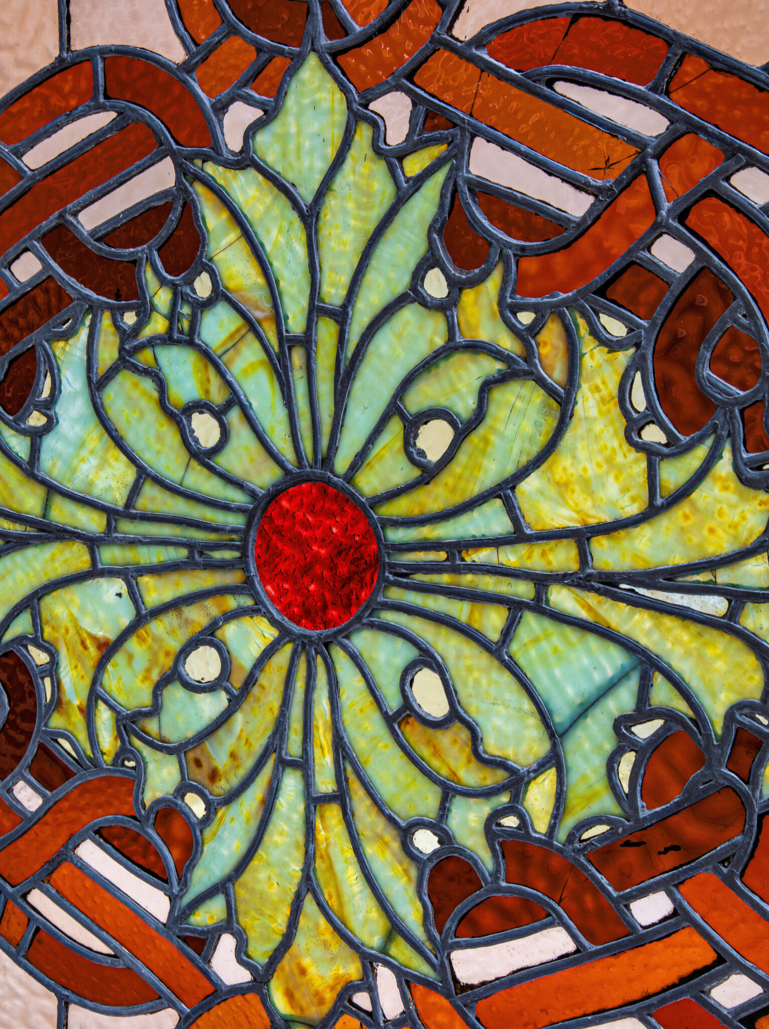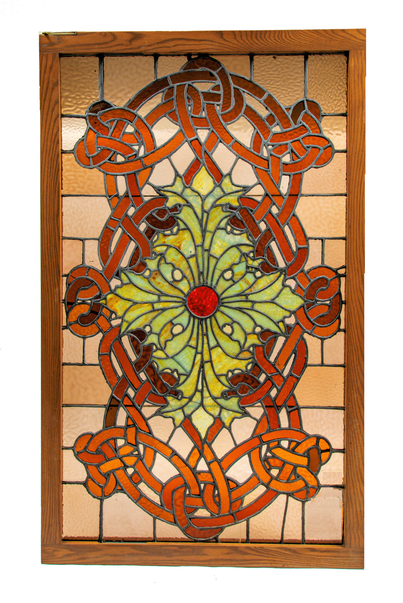 the bldg. 51 museum and archive secured an original healy and millet-designed oversized leaded stained glass skylight window salvaged from adler and sullivan’s 1889-90 auditorium theater. the hinged window has been releaded within a newly-built solid oak wood frame. the original centrally located ruby red faceted jewel was lost long ago (given their size and weight, many dropped from the windows over the course of time and were damaged and/or discarded) and replaced with stained glass. the window is largely intact and stable, with hairline cracks evident.