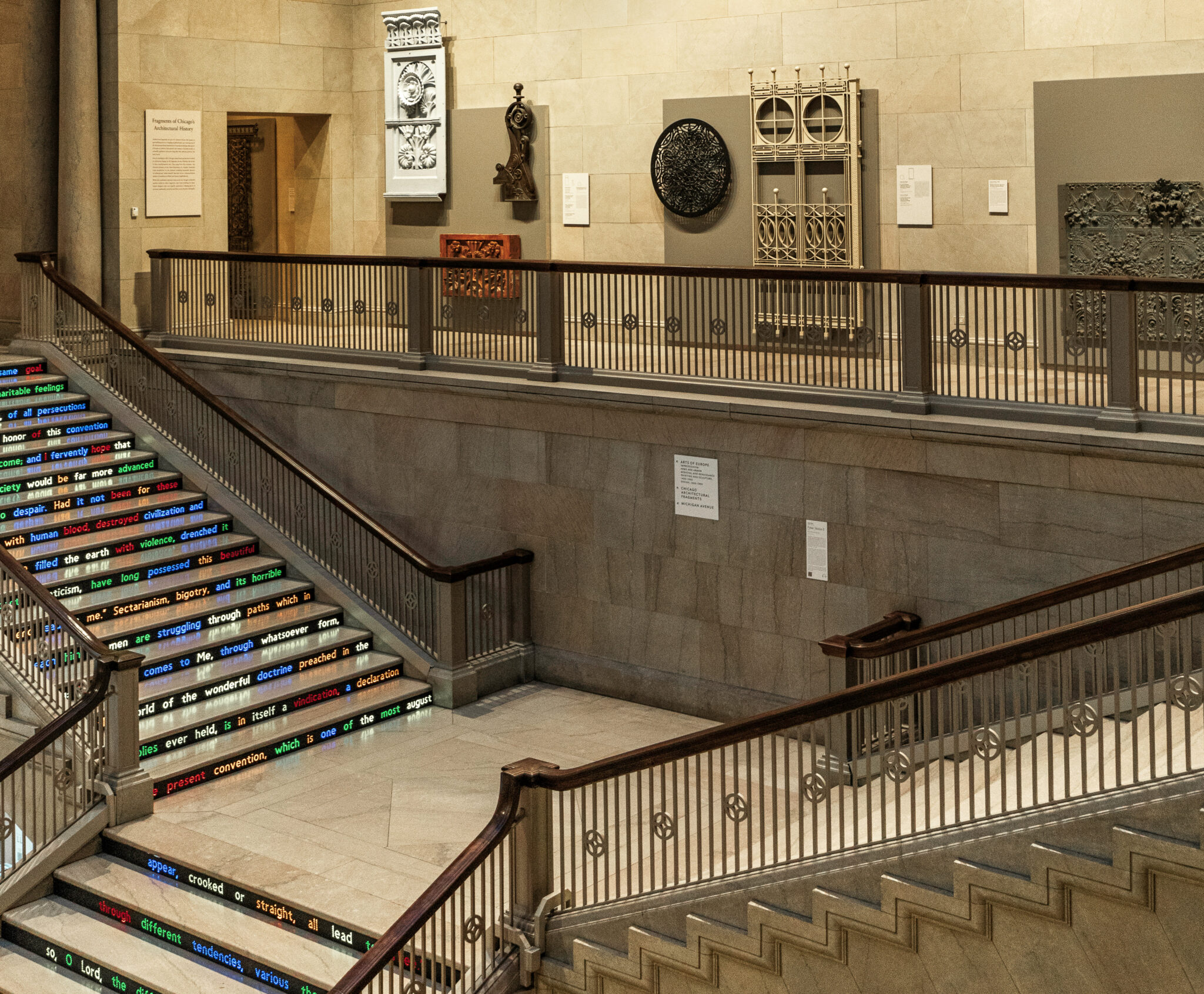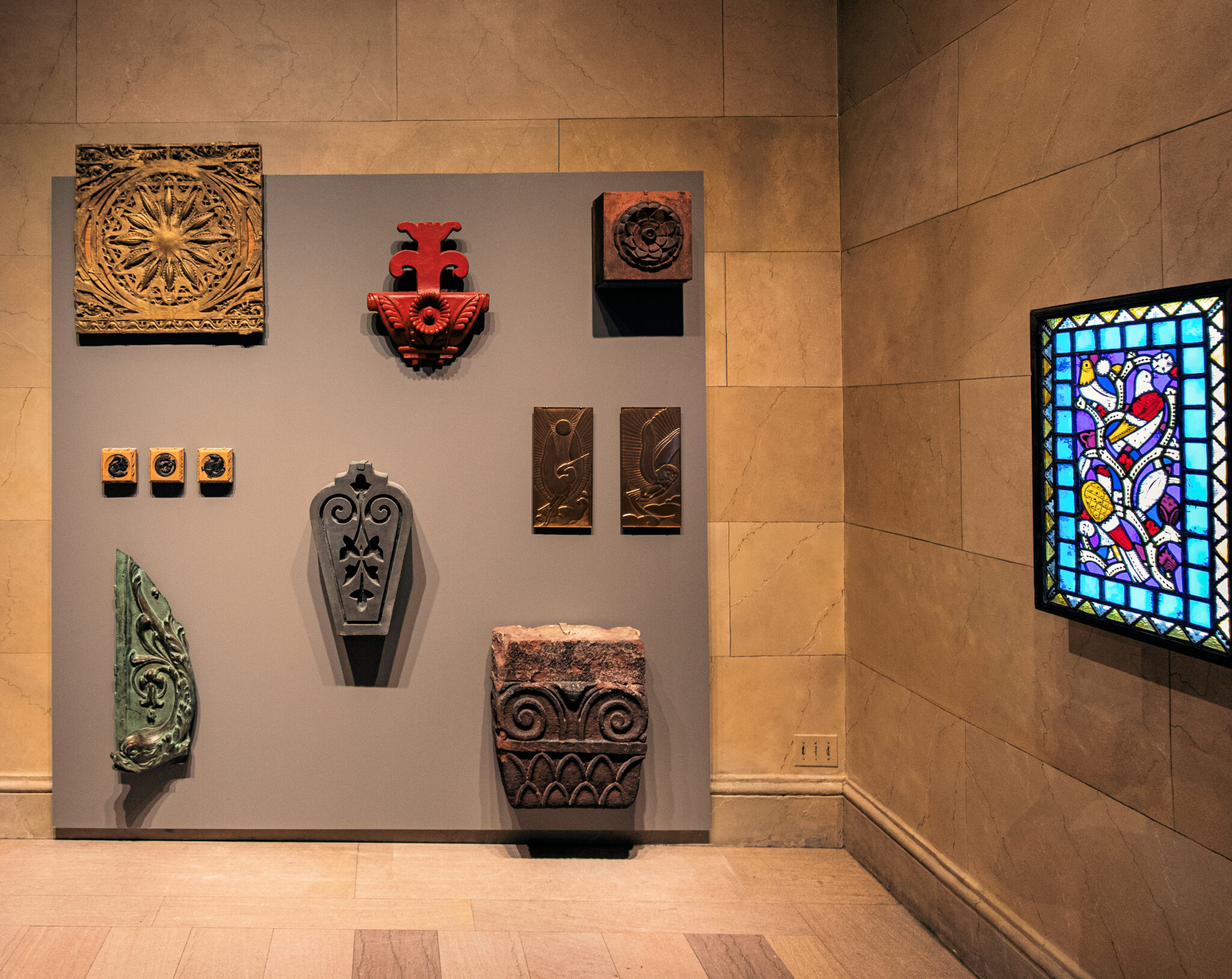 the majority of the images however, doument the reconfigured “fragments of chicago’s past exhibit,” mounted opposite the hartwell memorial tiffany window (1917) within the skylit henry crown gallery.