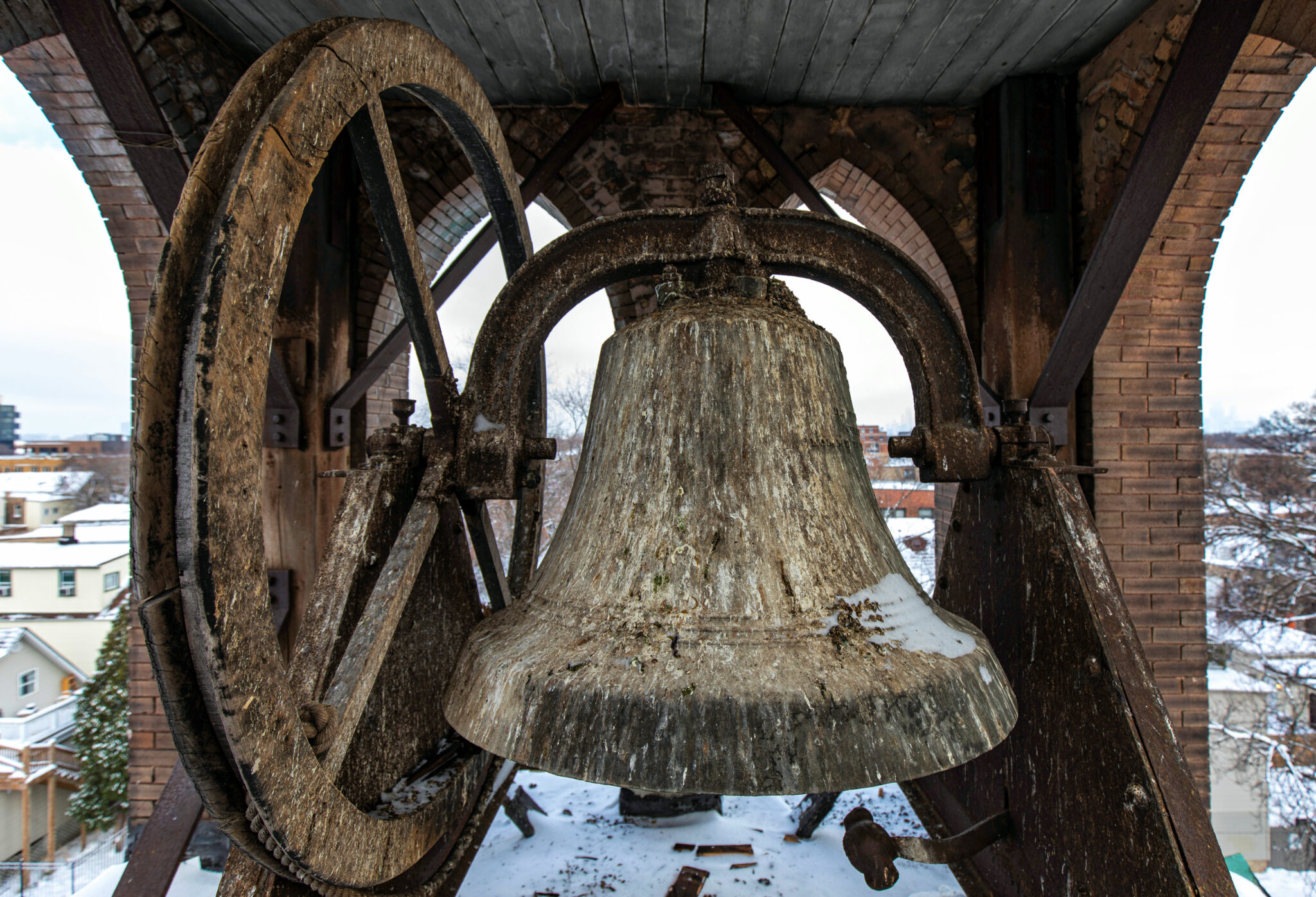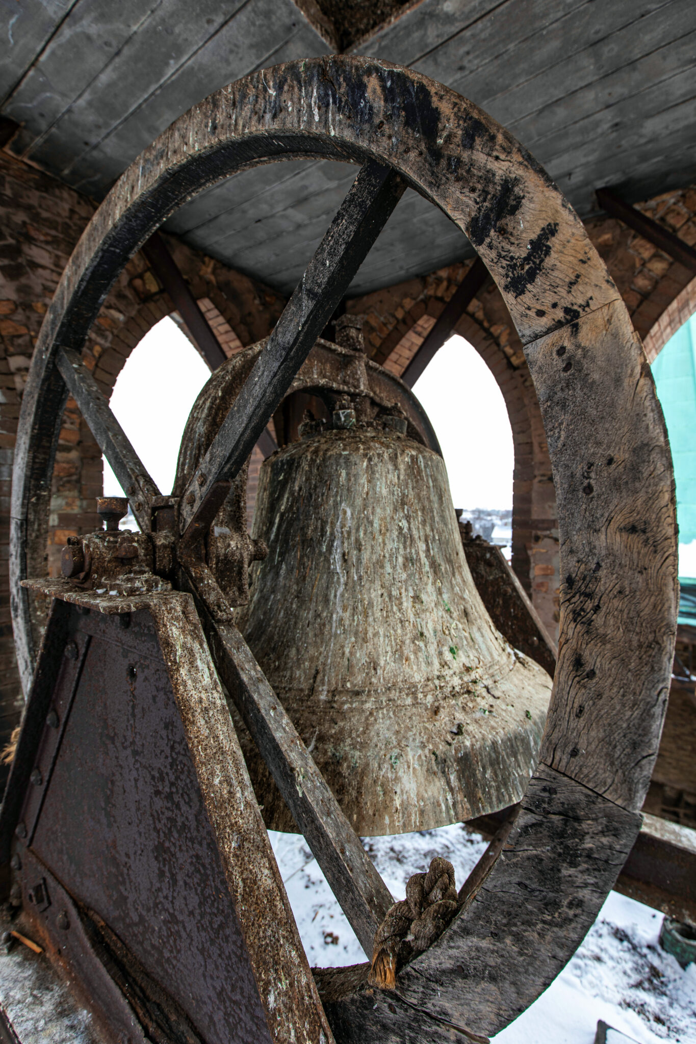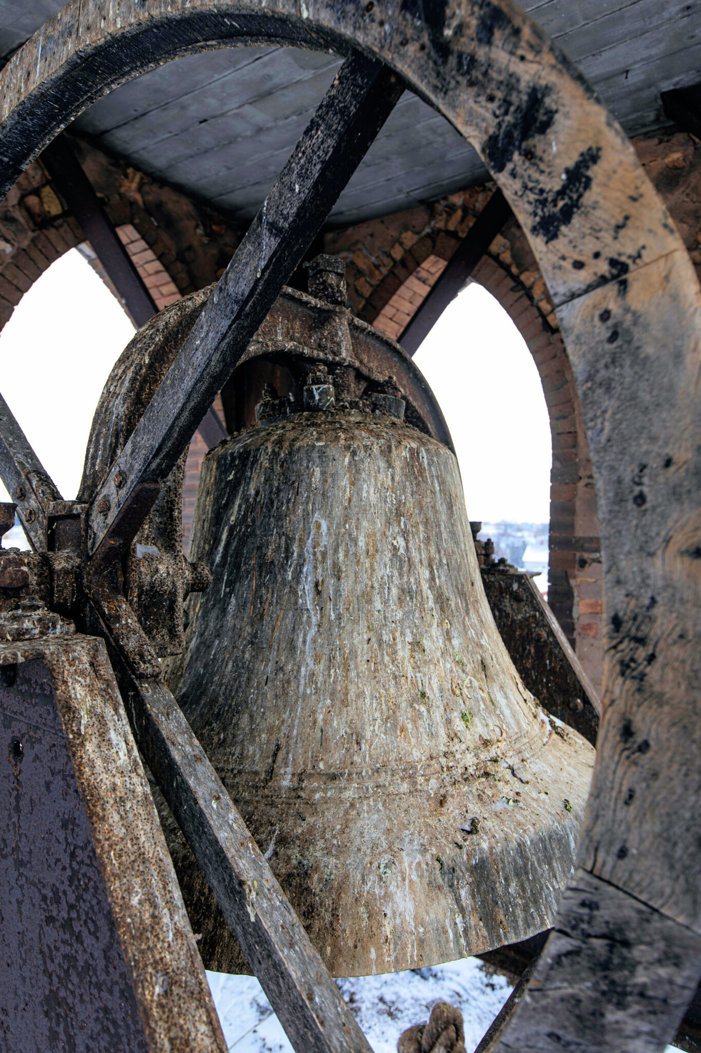the 1896 solid bronze bell is intact – comprised of flanking cast iron a-frame bases or stands, yoke, clapper and bent wood wheel with a single sheave (original rope present).