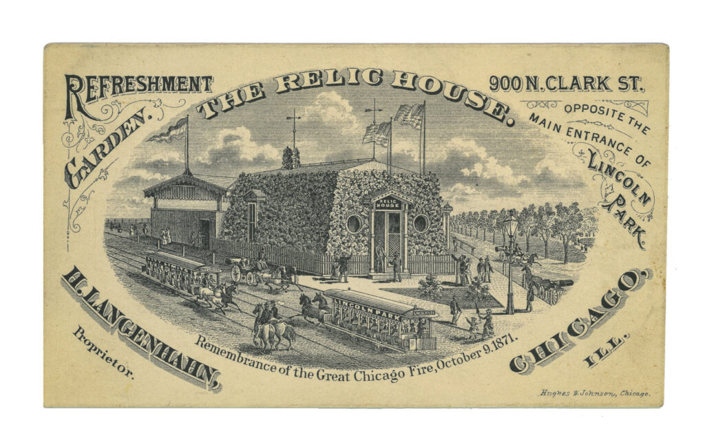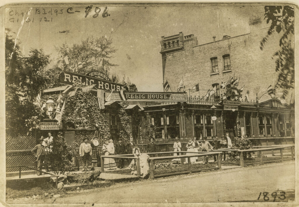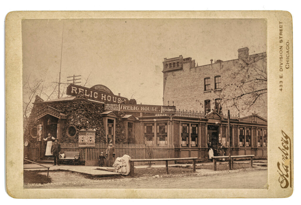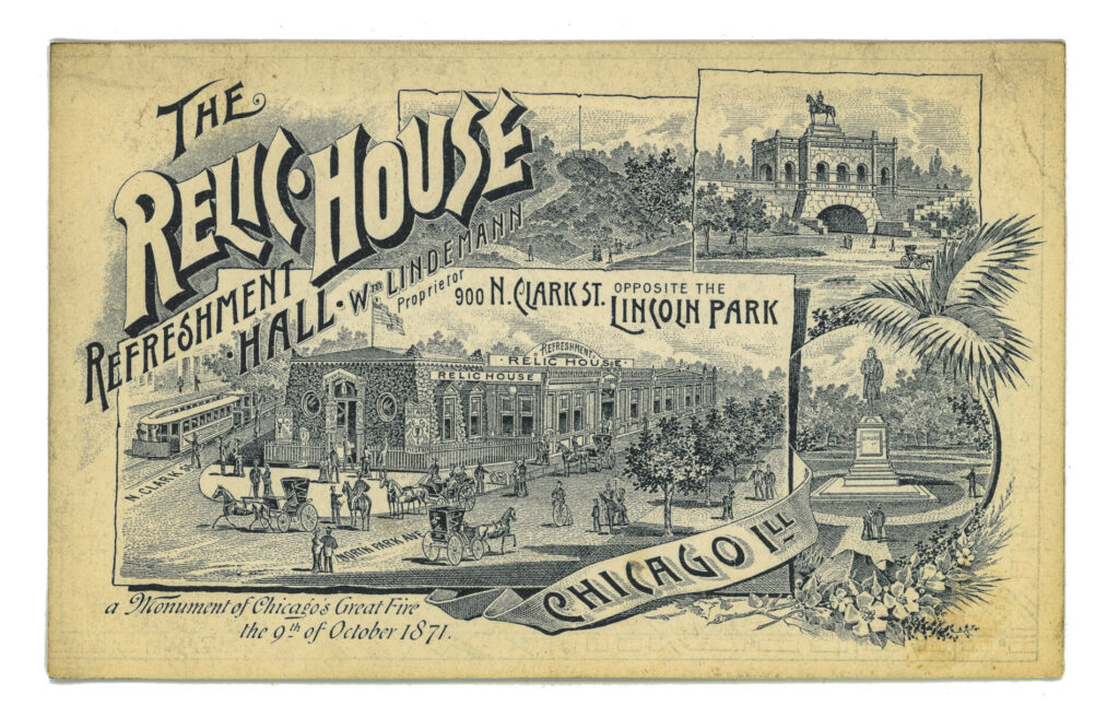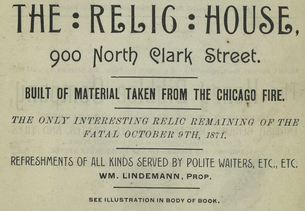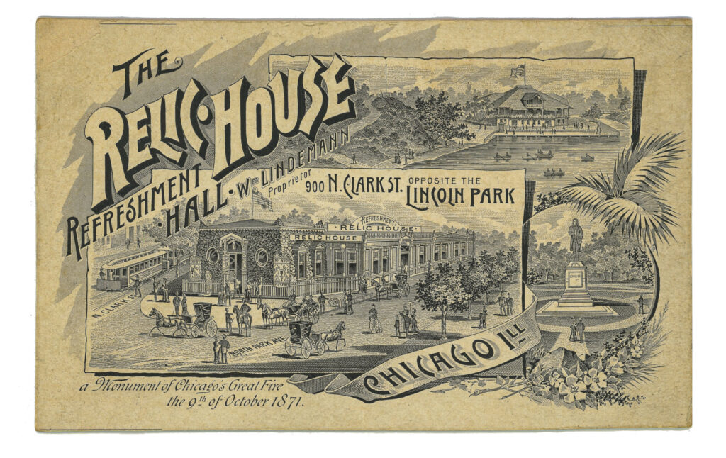 relic house, a historic chicago saloon and restaurant, was built in 1872 from materials salvaged after the great chicago fire of 1871. originally at north park avenue and center street, it later moved near north clark street and lincoln park west. throughout its history, it served as a saloon, german restaurant, prohibition speakeasy, and hub for artistic groups like the dil pickle club. the building was demolished in 1926 (some sources cite 1929) for an apartment complex.