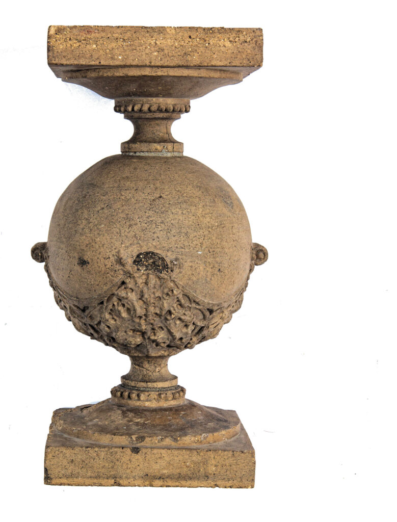 most of the surviving balusters exhibit some degree of damage, espeically around the necks and bases. a single centrally located iron rod was used to reinforce them. the balusters were executed by the northwestern terra cotta company, chicago, il.