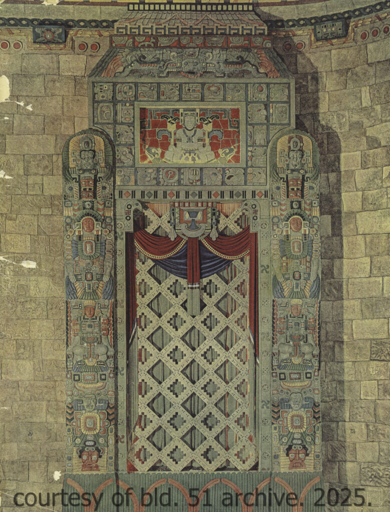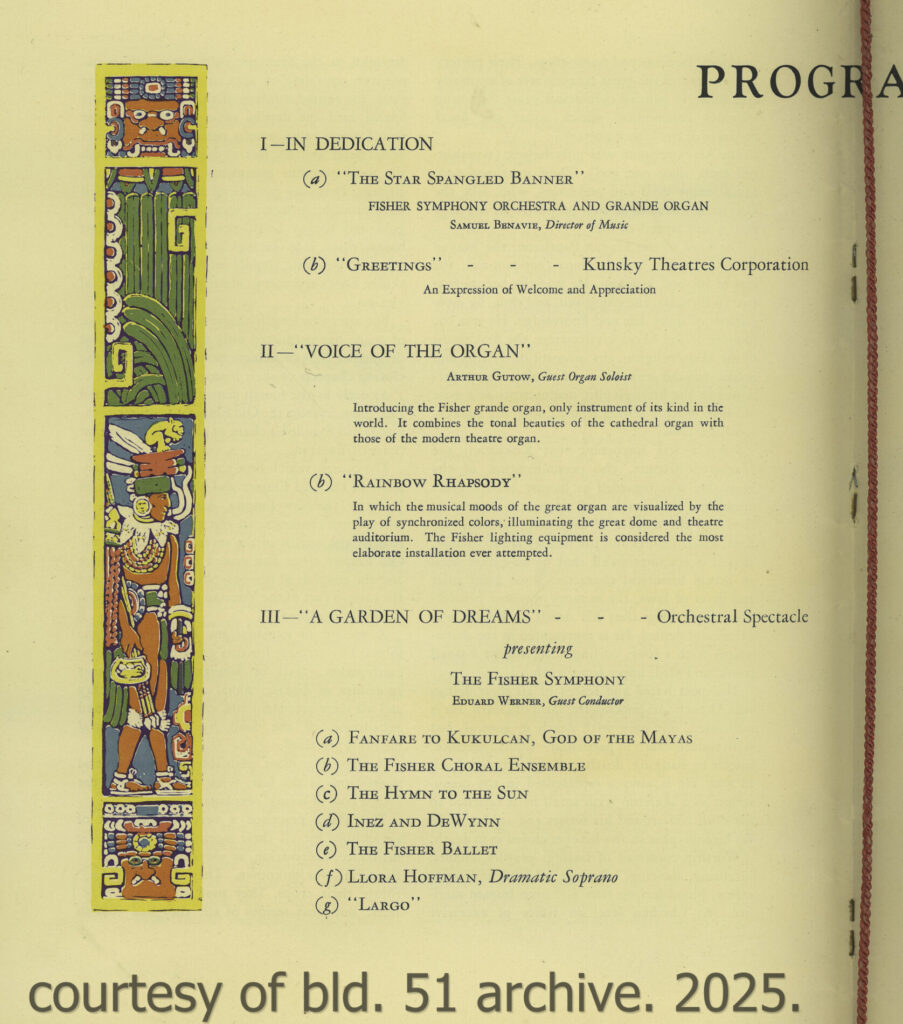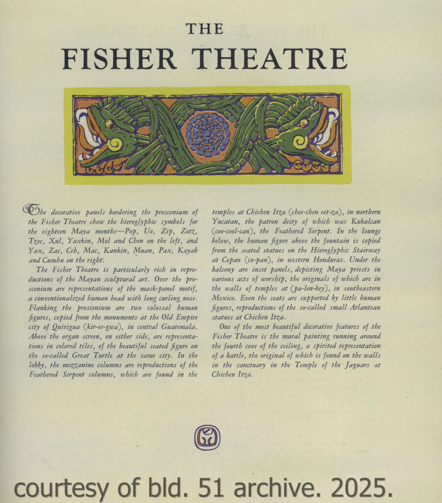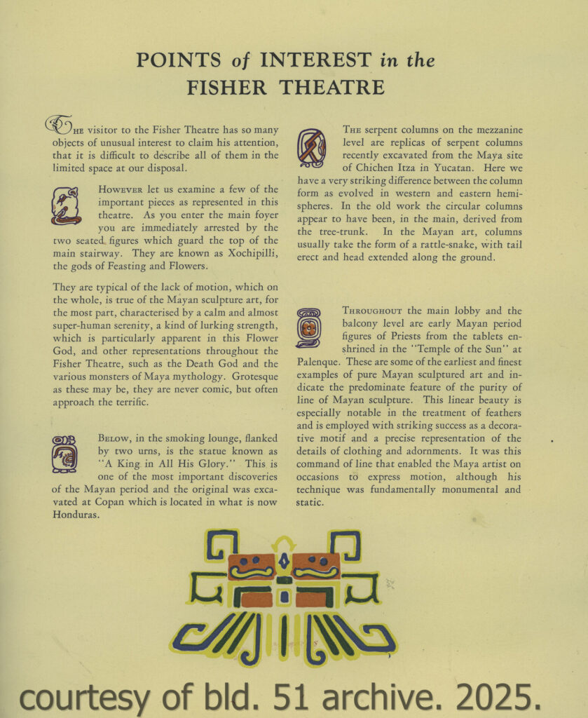 an original dedication booklet, dated november 15, 1928, documents the opening of mayger and graven’s 2,700-seat mayan revival theater, located in albert kahn’s art deco fisher building at 3011 west grand blvd., detroit, mi. the kunsky circuit theater was designed to accommodate both vaudeville performances and motion pictures, featuring luxurious seating, two balconies, an orchestra pit, and a large four-manual, 36-rank wurlitzer organ. the lobby included distinctive amenities such as a goldfish pond, live banana trees, and macaws which patrons could feed while awaiting performances.