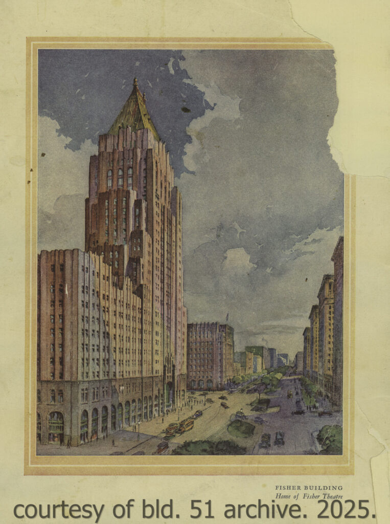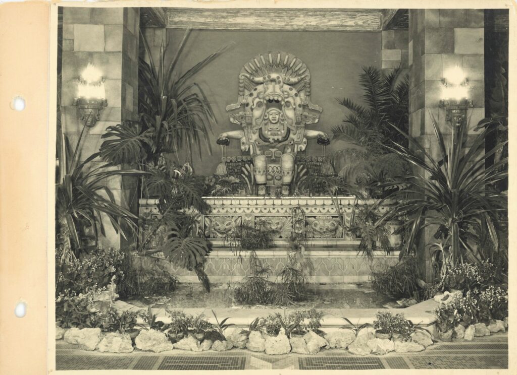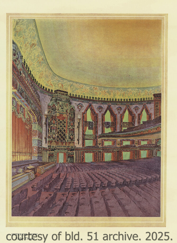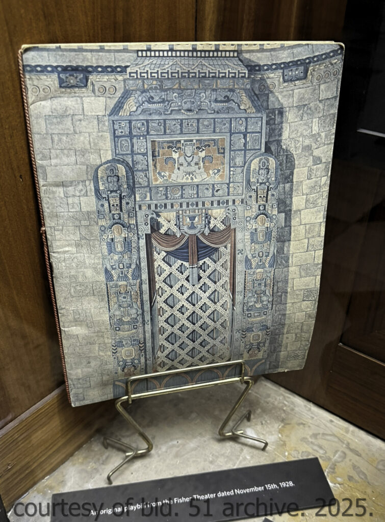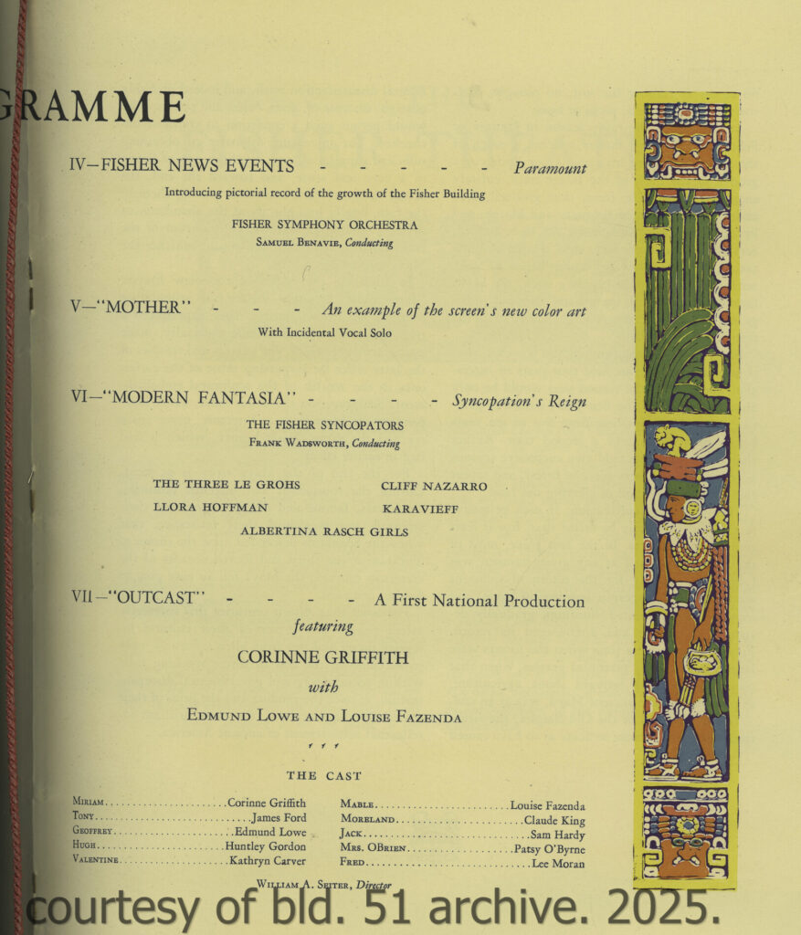 an original dedication booklet, dated november 15, 1928, documents the opening of mayger and graven’s 2,700-seat mayan revival theater, located in albert kahn’s art deco fisher building at 3011 west grand blvd., detroit, mi. the kunsky circuit theater was designed to accommodate both vaudeville performances and motion pictures, featuring luxurious seating, two balconies, an orchestra pit, and a large four-manual, 36-rank wurlitzer organ. the lobby included distinctive amenities such as a goldfish pond, live banana trees, and macaws which patrons could feed while awaiting performances.