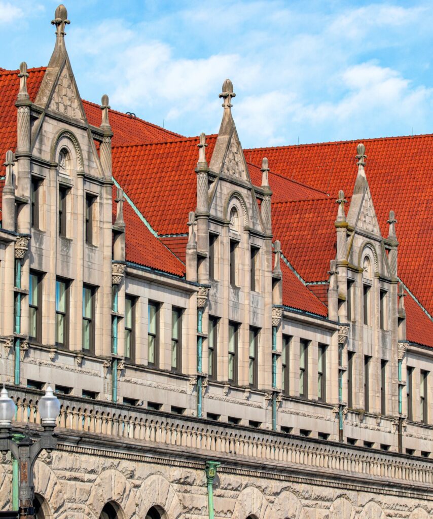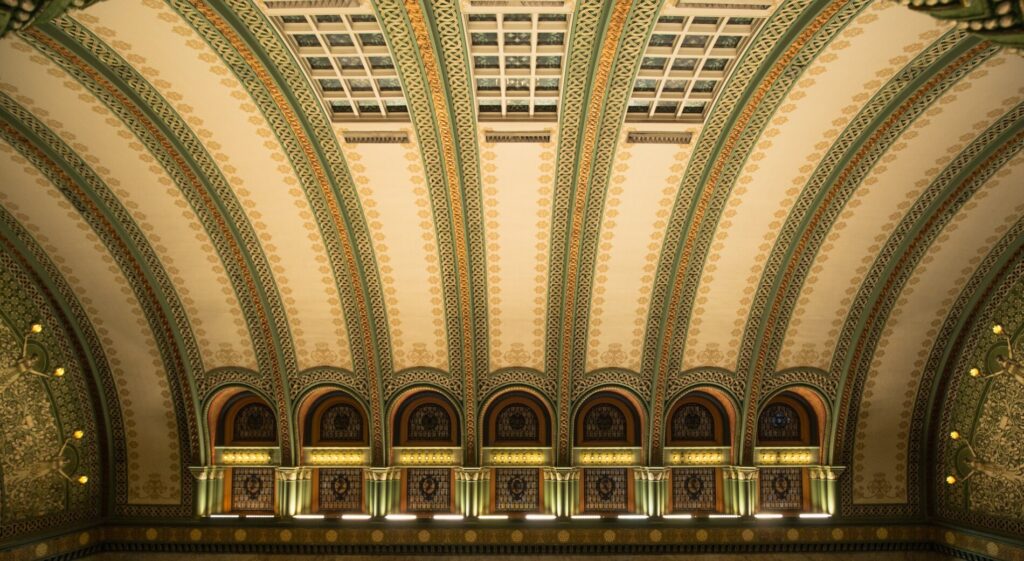 Union Station opened on September 1, 1894, designed by Theodore Link with engineering by George H. Pegram. It included a headhouse, midway, and a vast trainshed, originally housing 32 tracks. The headhouse featured a hotel, restaurant, waiting rooms, and ticketing offices, showcasing a gold-leaf Grand Hall, Romanesque arches, and a 230-foot clock tower.