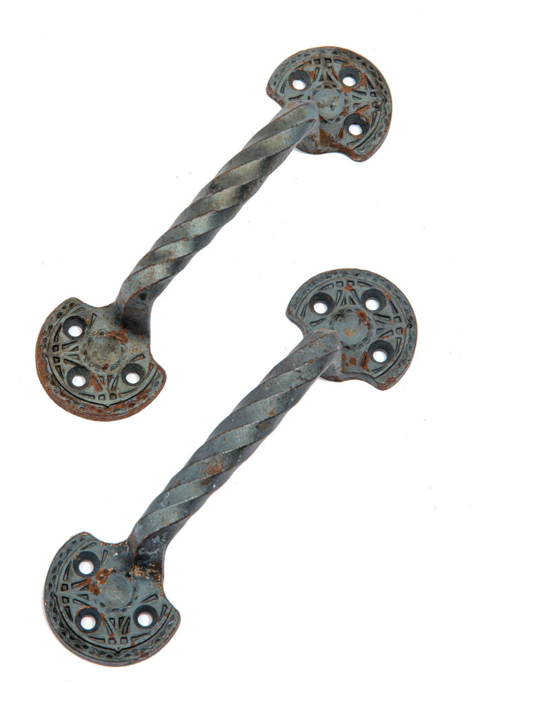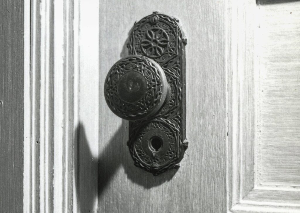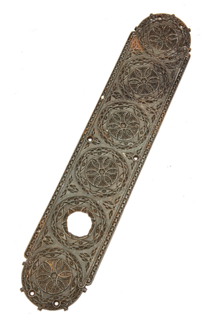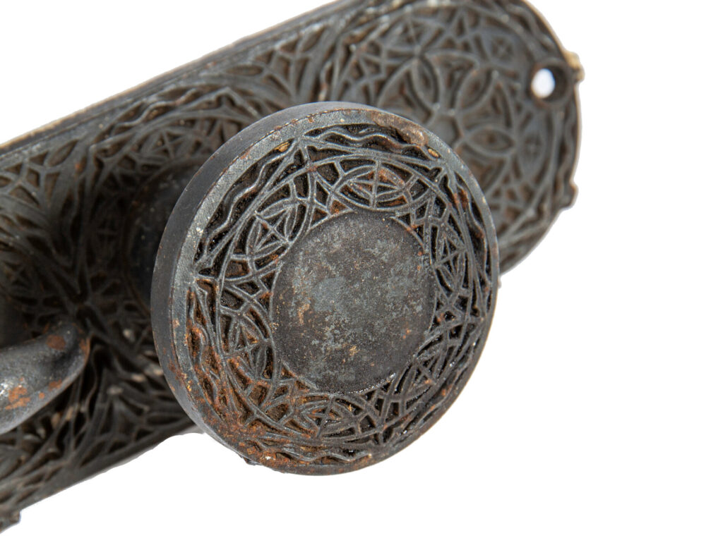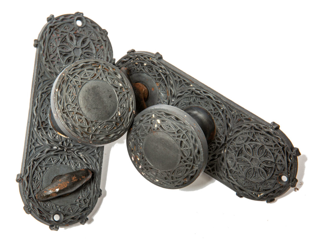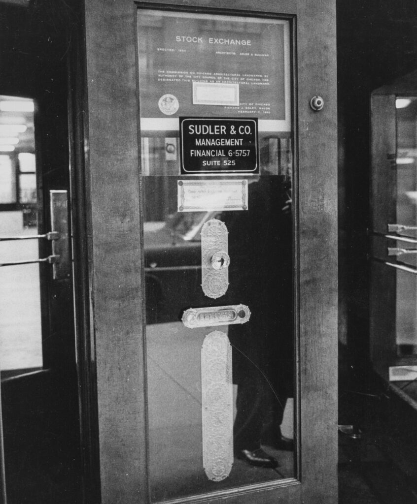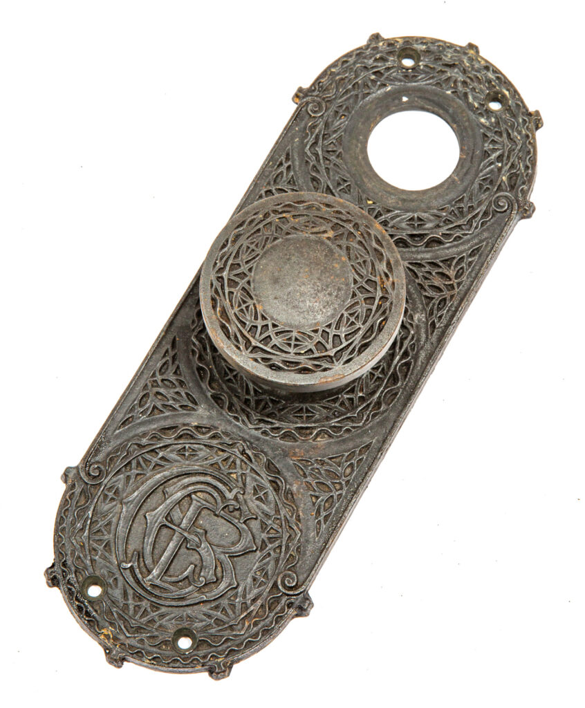 adler and sullivan’s chicago stock exchange (1894) was outfitted with sullivan-designed cast iron hardware with a bower-barff “rust-proof” finish. the main office doors contained oversized knobs and backplates with monogram. yale and towne fabricated the hardware under the supervision of orr & lockett.