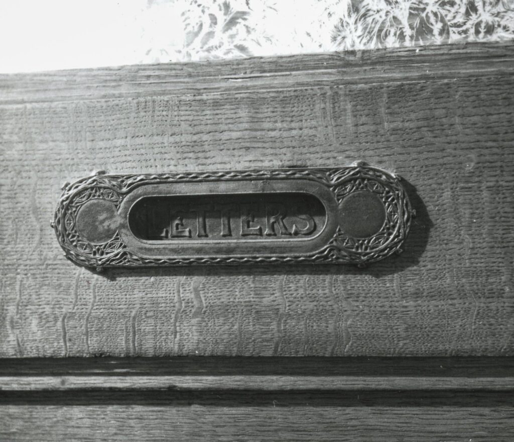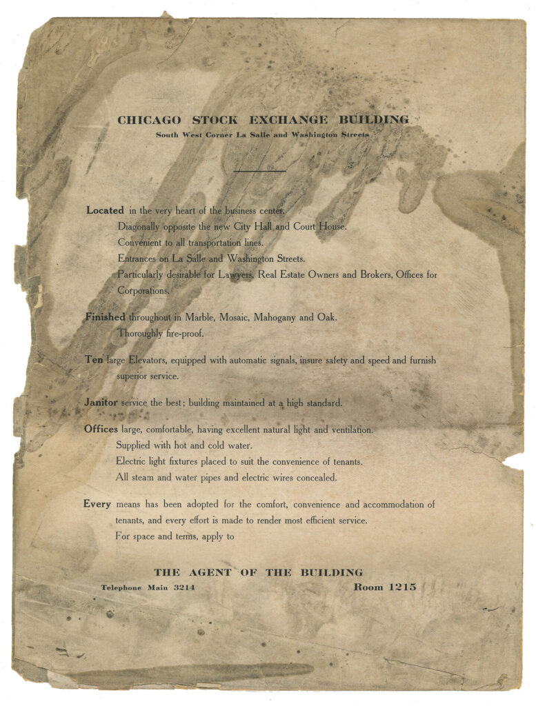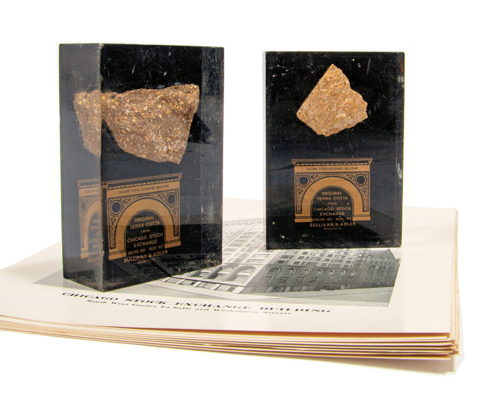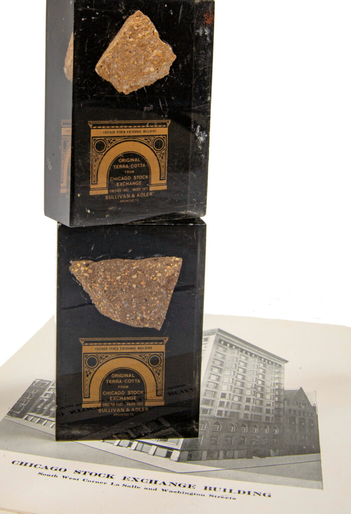 several boxes of original louis h. sullivan-designed chicago stock exchange building custom door hardware were obtained for the bld. 51 museum and archive – all of it salvaged by three oaks wrecking company. the plethora of historically important hardware had been in storage since the building’s demolition in 1972. in addition, various souvenirs and rental brochures were included in the boxes. the image gallery below offers a glimpse at what was uncovered and documented when the boxes were opened.