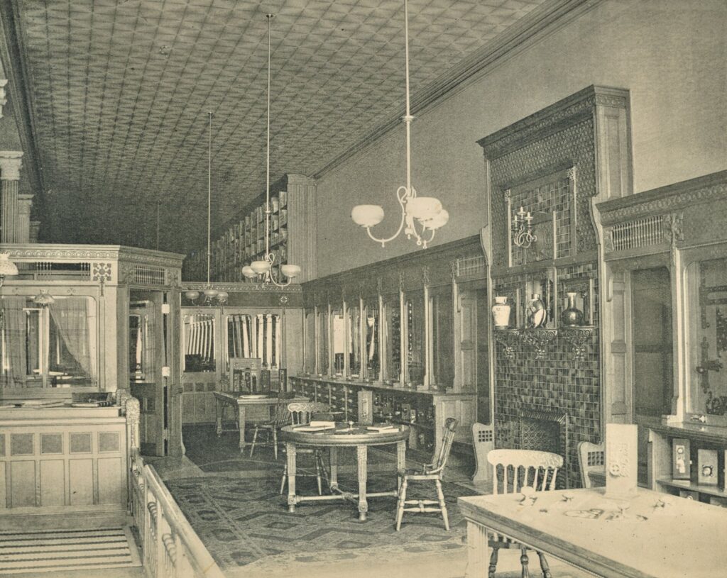 the trading room: at its core, the building featured a striking double-height room on the second floor. famous for its “organic ornamentation,” it showcased detailed stenciling in 52 unique colours along with ornate plaster capitals.