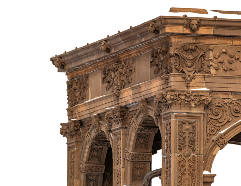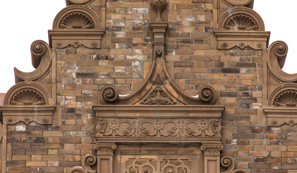 both the original buff-colored slip glaze ornamental terra cotta (executed by the northwestern terra cotta company of chicago) and matching face brick (fabricated by the anderson pressed brick company, chicago, il.) were in desperate need of repair and/or replacement (see extensive spalling in images taken prior to scaffold being erected around the house).