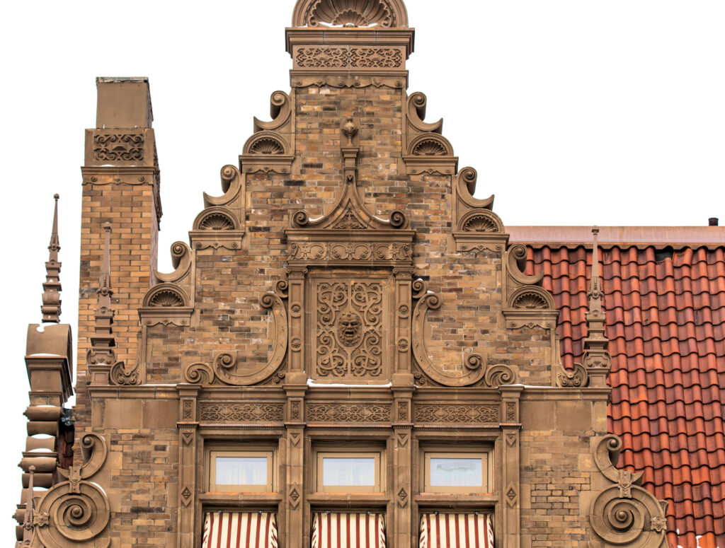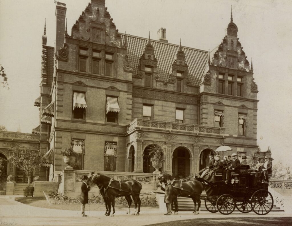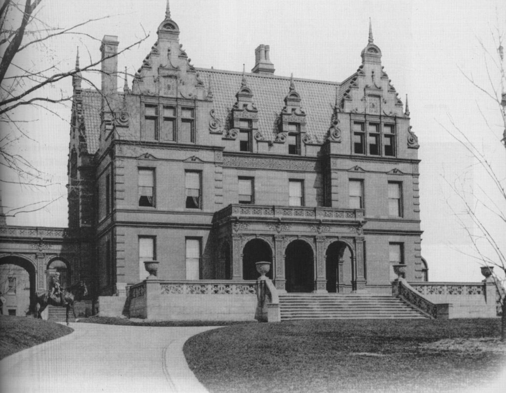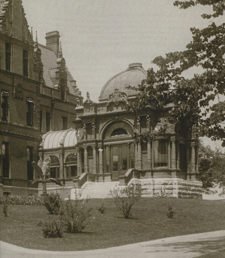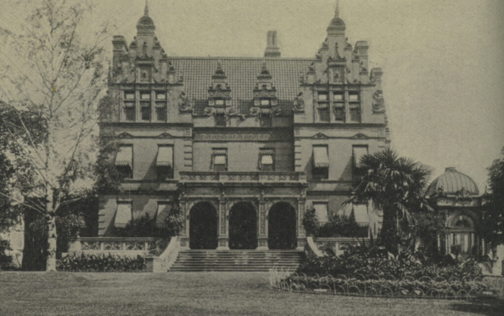 around 1890, captain pabst asked milwaukee architect george bowman ferry to design a mansion in the flemish renaissance revival style. a building permit was issued on june 27, 1890, and construction lasted two years. ferry’s three-story house featured a pressed brick exterior with corner quoins, carved stone, and terra cotta ornamentation. the characteristic symmetry and shaped parapets mark the flemish renaissance revival style. originally, inside there was a men’s parlor decorated in mahogany and a ladies’ parlor finished with white enamel.