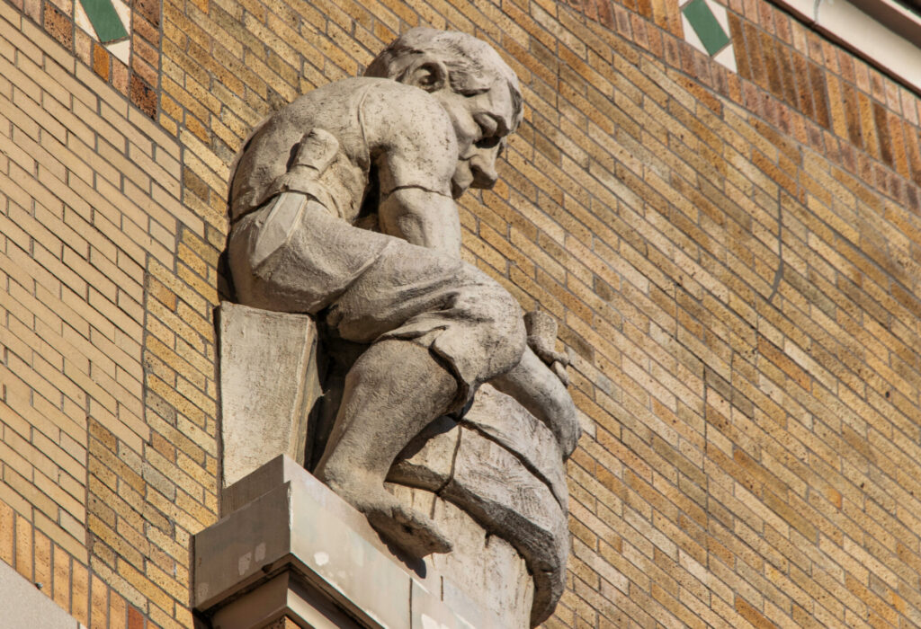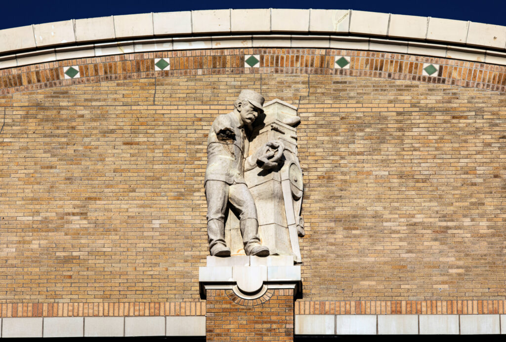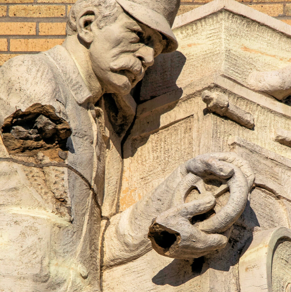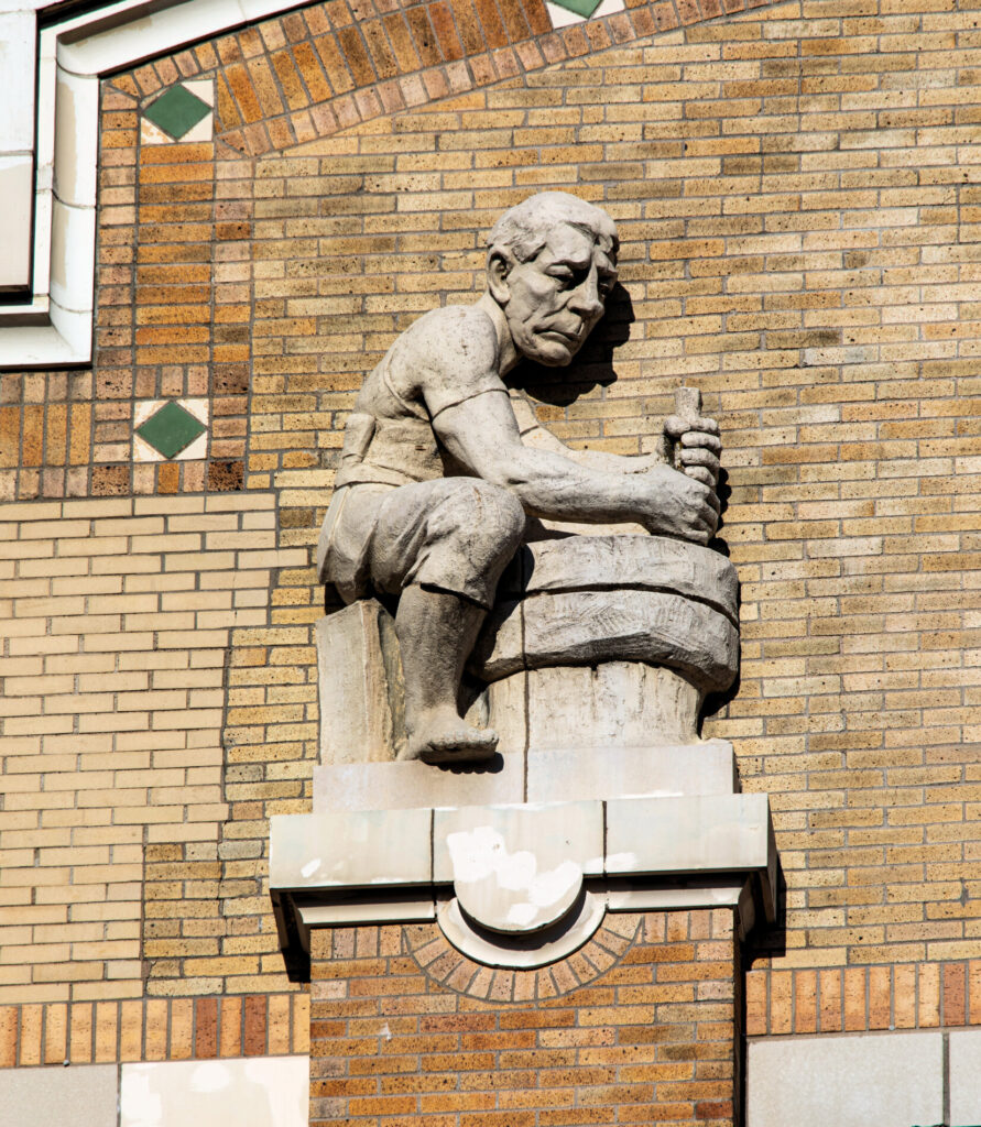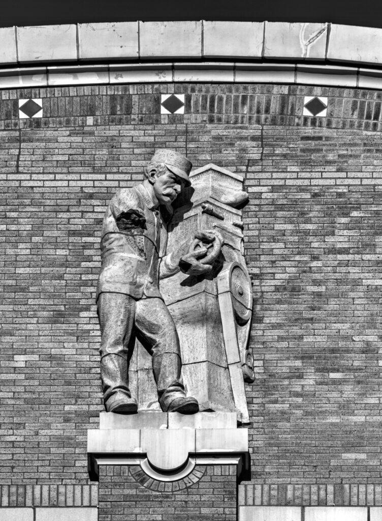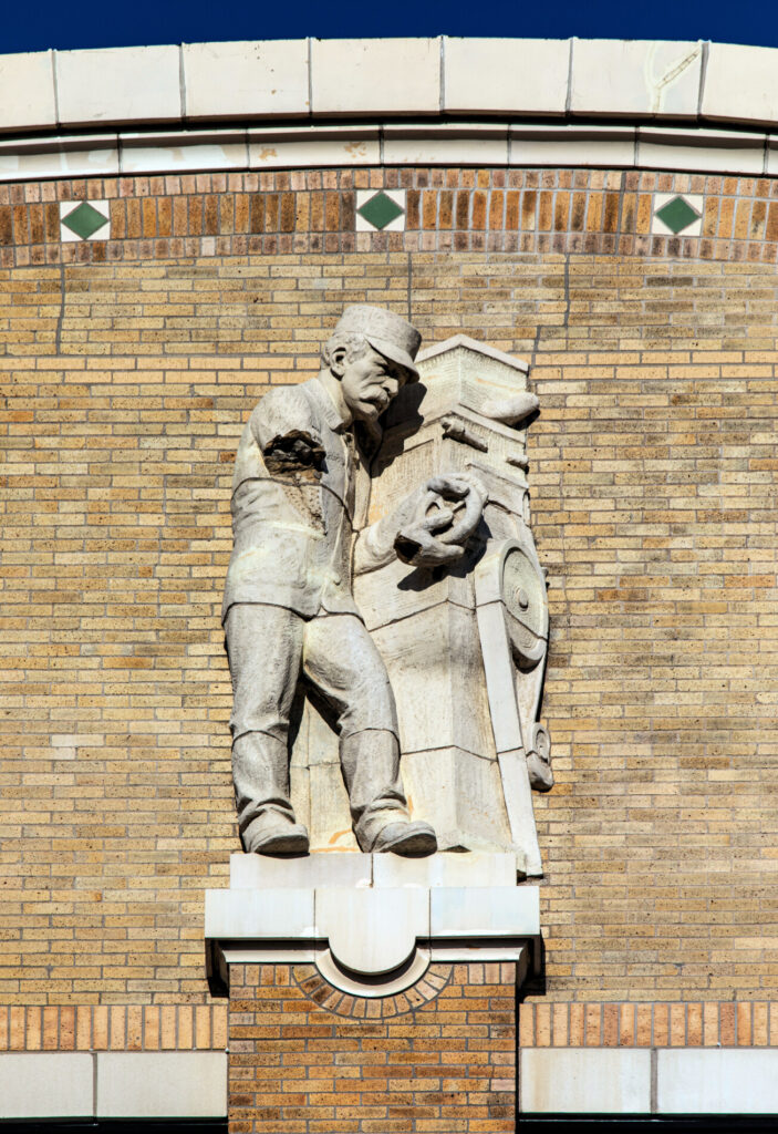 sculptor john karl daniels created these figures by observing mill workers rather than working from models. initially carved at half-size (three to four feet tall), they were then doubled and reproduced in glazed terra-cotta. daniels was compensated $200 to $300 for one and a half months of work. the building’s design features two large central windows within a horizontal band, balanced by two smaller windows on each end.
