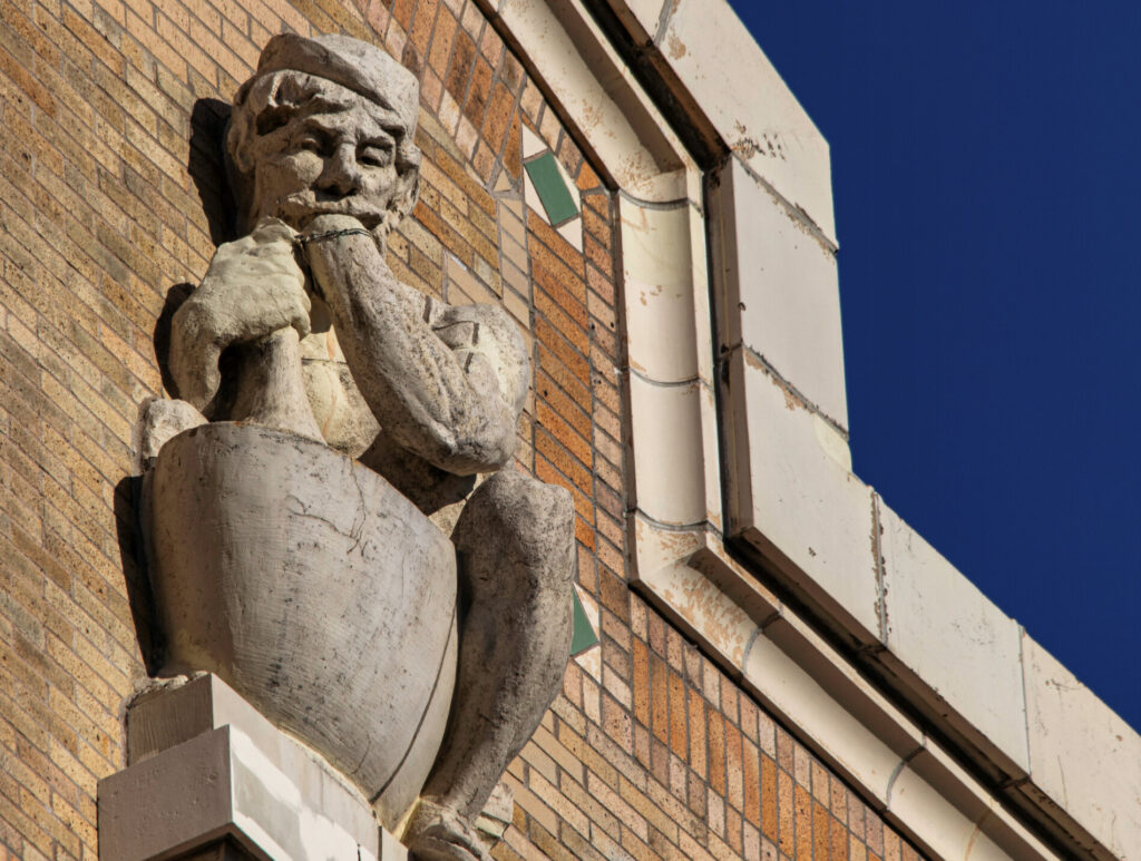 for many years, if not decades, if documented the three john karl daniels’s white glazed terra cotta figures adorning hewitt and brown’s 1914 washburn crosby utility building, located at 700 second street, minneapolis, mn. i’m both amused and mystifed over the circumstances surrounding the disappearance of the centrally located “modern miller” missing arm. the hand is present, but the arm has joined the realms of the non-existent.