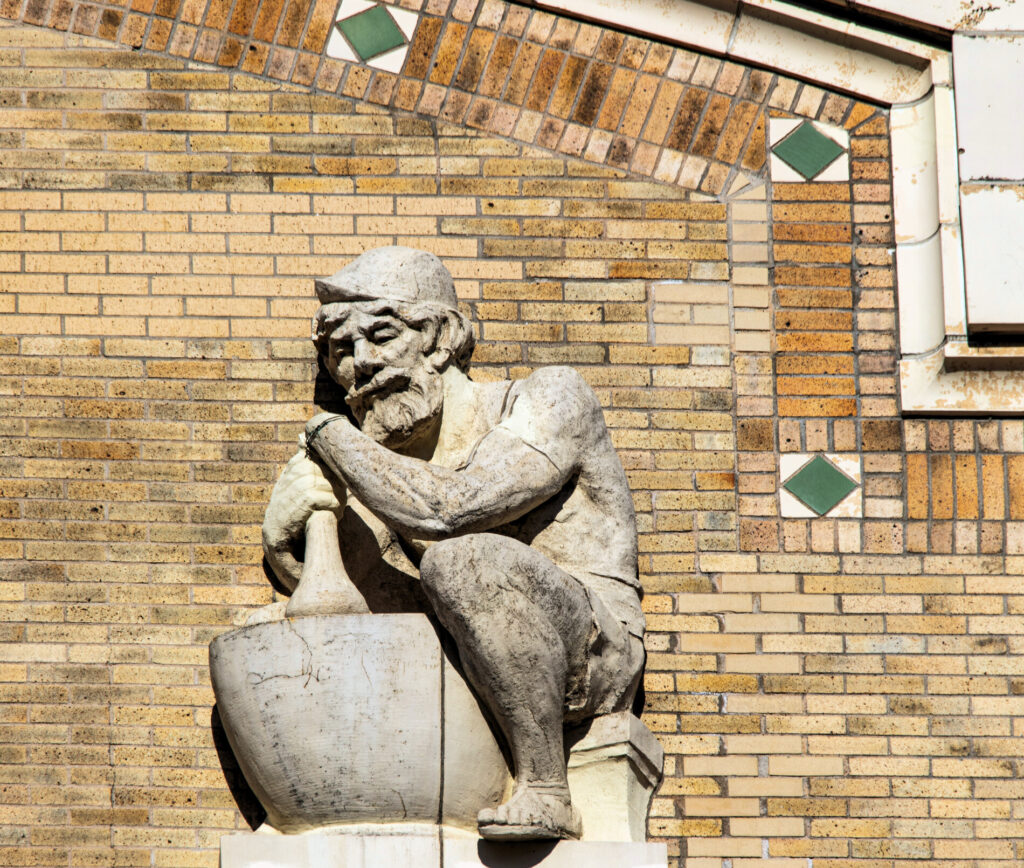 design and structure: the building features three terracotta figures of a 1914 modern miller, a primitive mortar user, and a quern user.