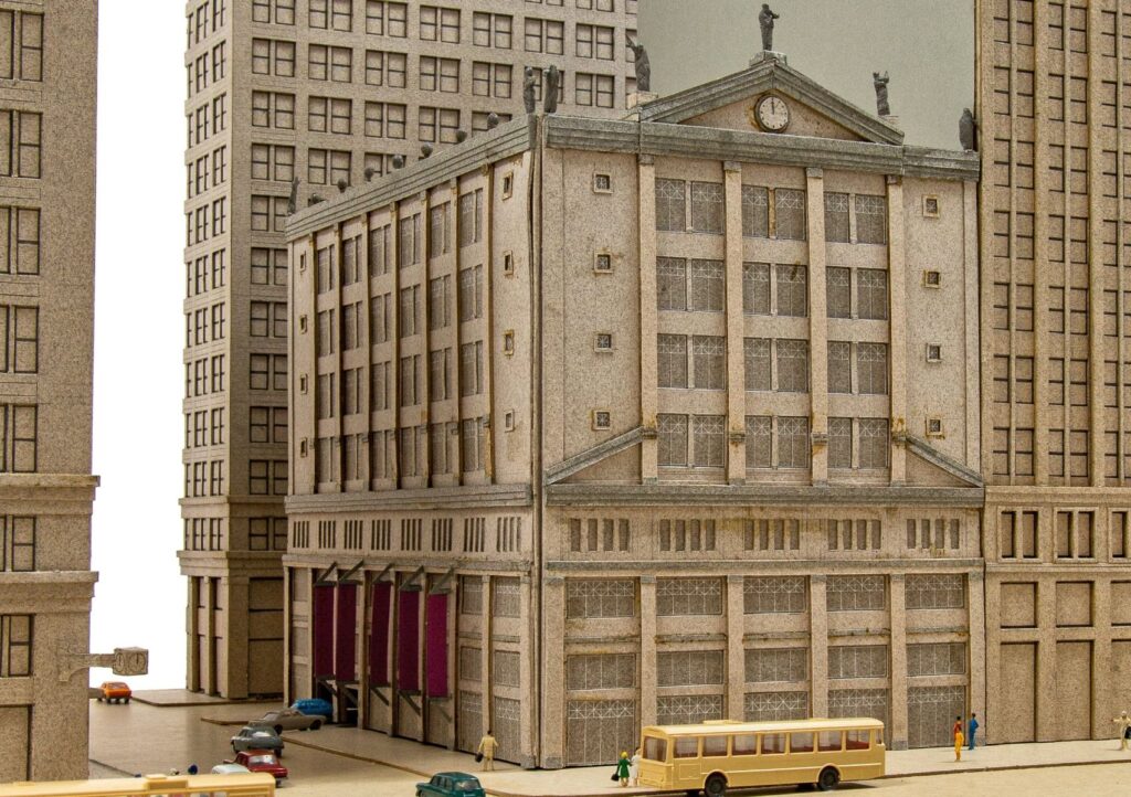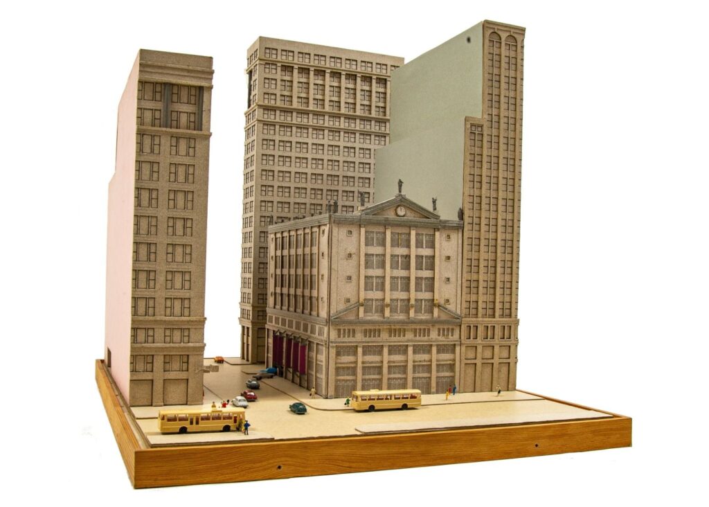 stanley tigerman’s oversized 1990s presentation model for a parking garage at state and washington streets’ southeast corner.