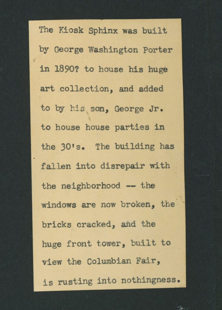 photographic images of washingtion porter’s beloved kiosk sphinx (louis i. simon, architect), located at 4043 lake park avenue, chicago, il.