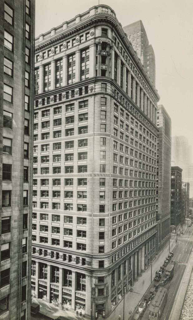 the burnham center replaced the chicago opera house (built 1885) and was part of marshall field’s real estate investment plan, which also funded the pittsfield building (1927) and field building (1934). burnham, a frequent collaborator with field, designed the building with frederick dinkelberg; after burnham’s passing in june 1912, ernest r. graham, peirce anderson, and edward probst finished the project under graham, burnham & co. the structure resembles burnham’s flatiron building in new york city, sharing beaux-arts styling, rounded corners, and likely influenced by rome’s palazzo di propaganda fide.