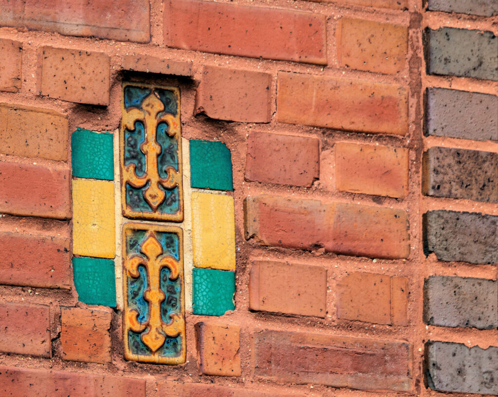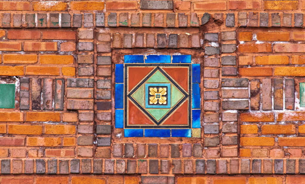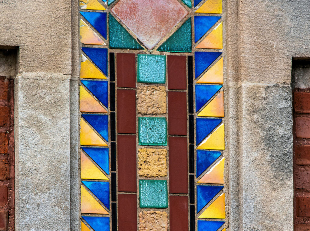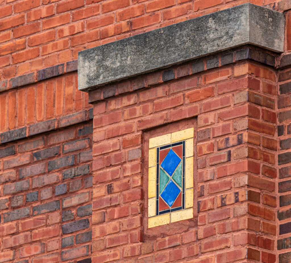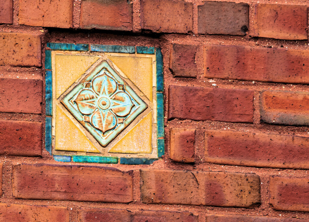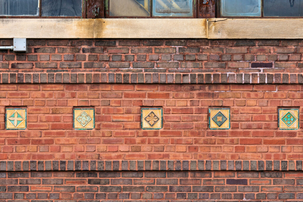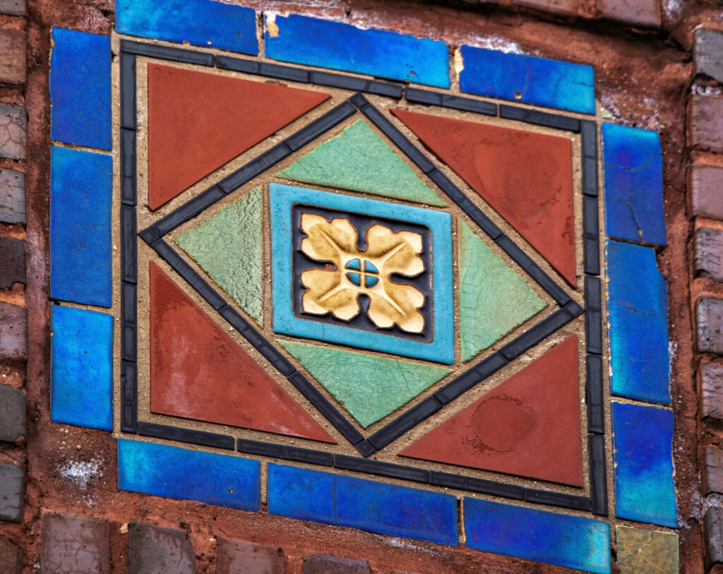 his earlier prairie style buildings were often accentuated with richly colored tiled panels arranged in simple geometric patterns. i’ve studied a few salvaged panels from demolished stations and nearly all are “stock” pattern tiles fabricated by mosaic tile company of zanesville, oh.