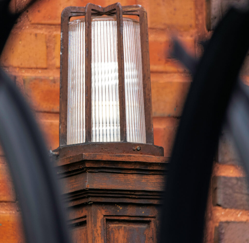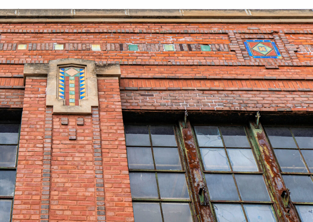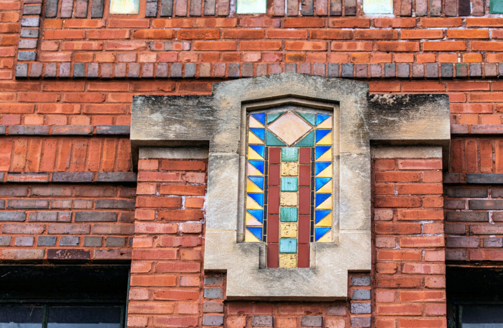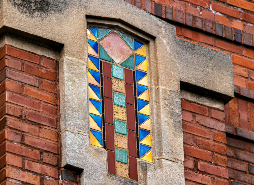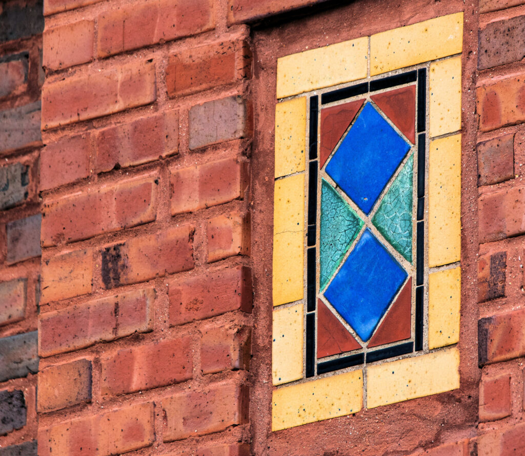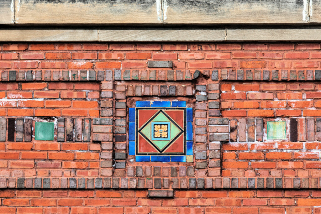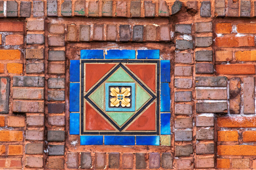 his earlier prairie style buildings were often accentuated with richly colored tiled panels arranged in simple geometric patterns. i’ve studied a few salvaged panels from demolished stations and nearly all are “stock” pattern tiles fabricated by mosaic tile company of zanesville, oh.