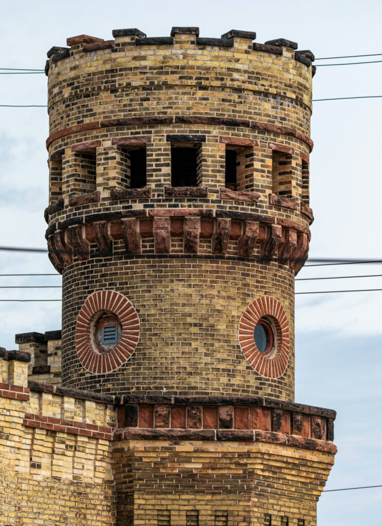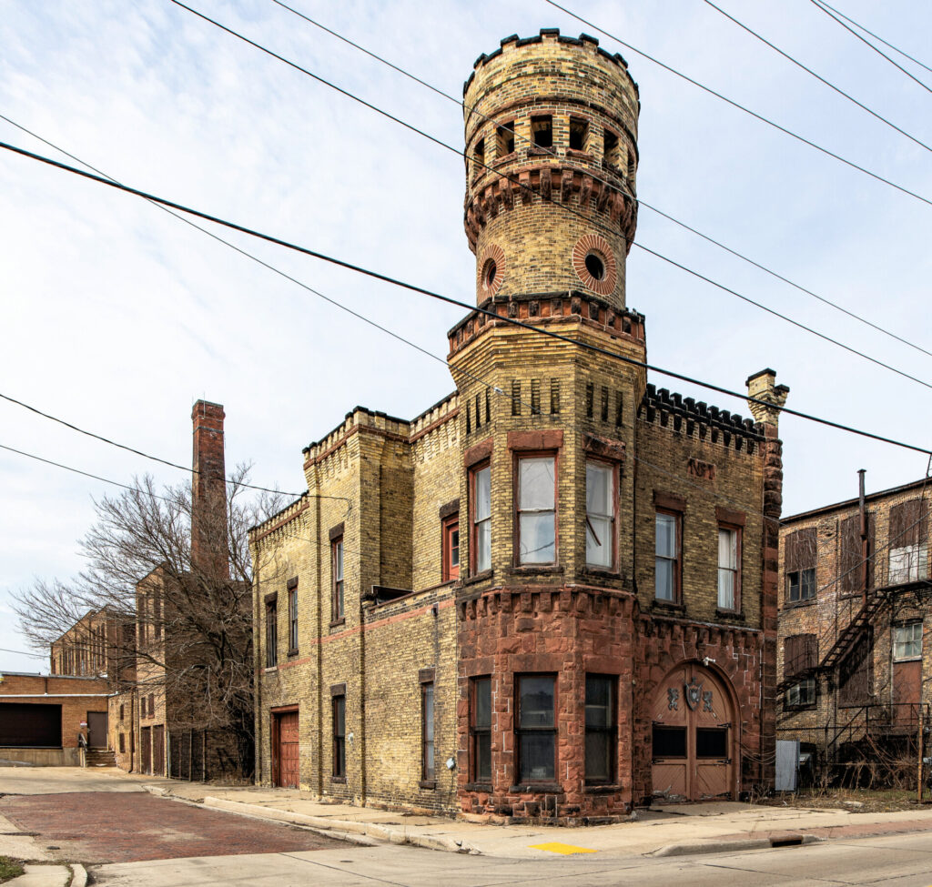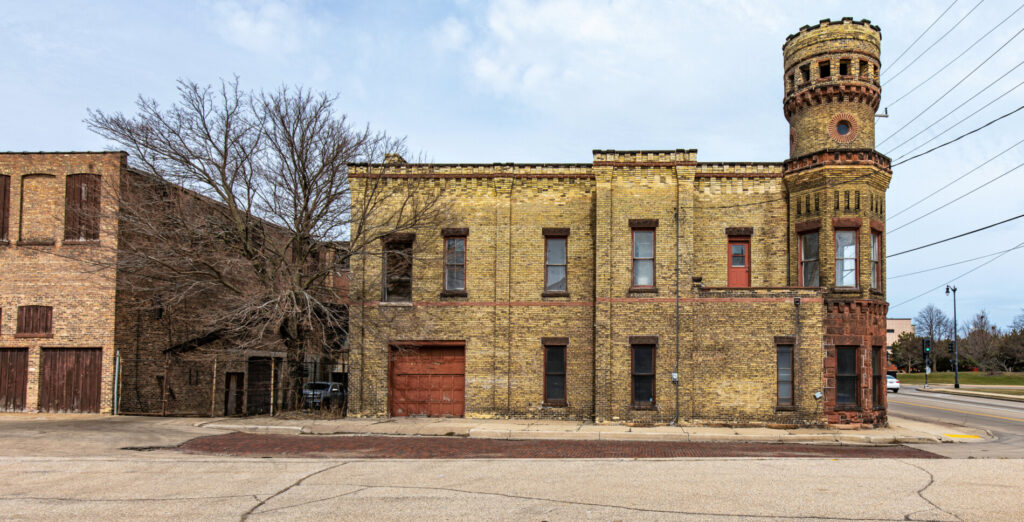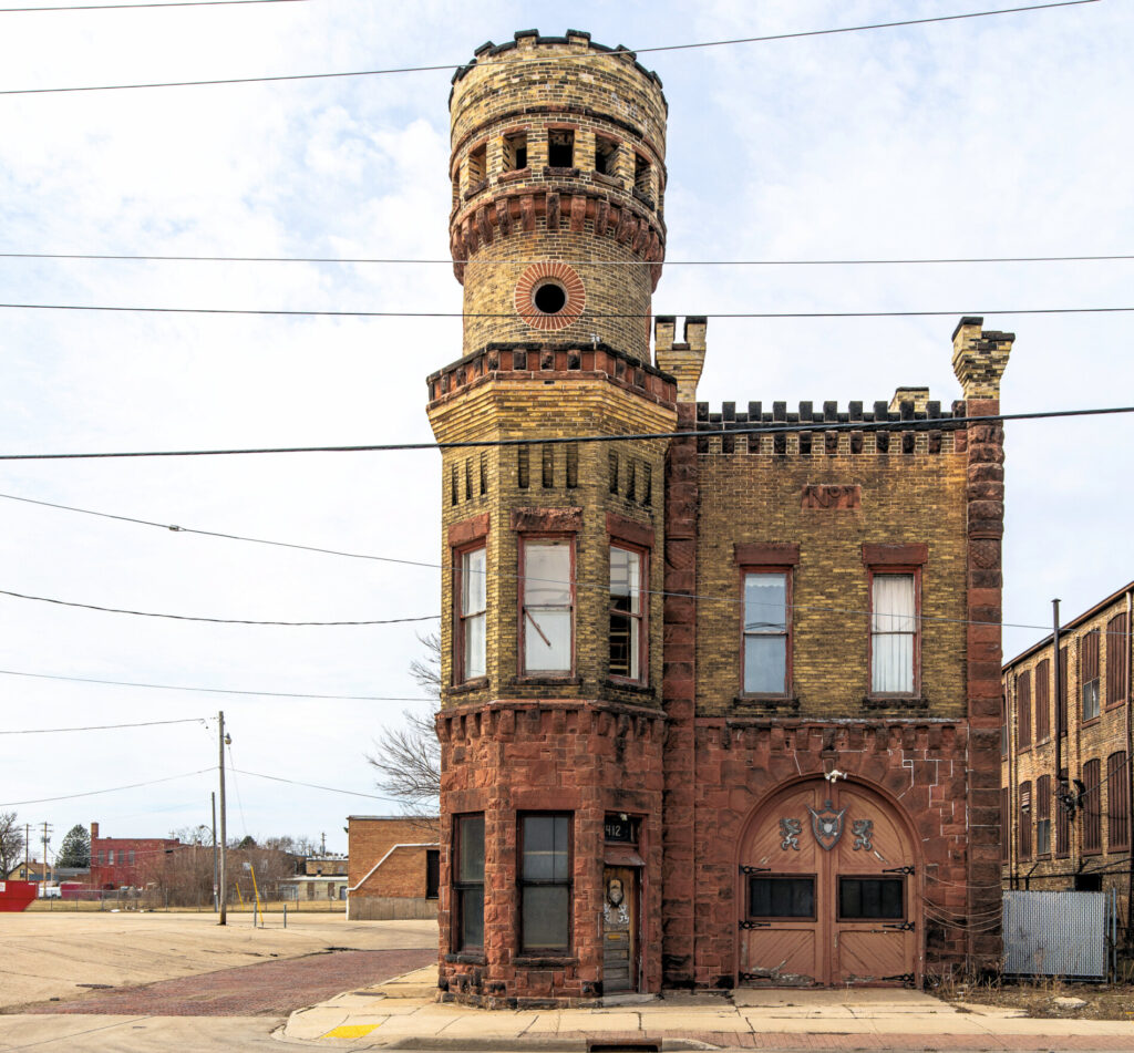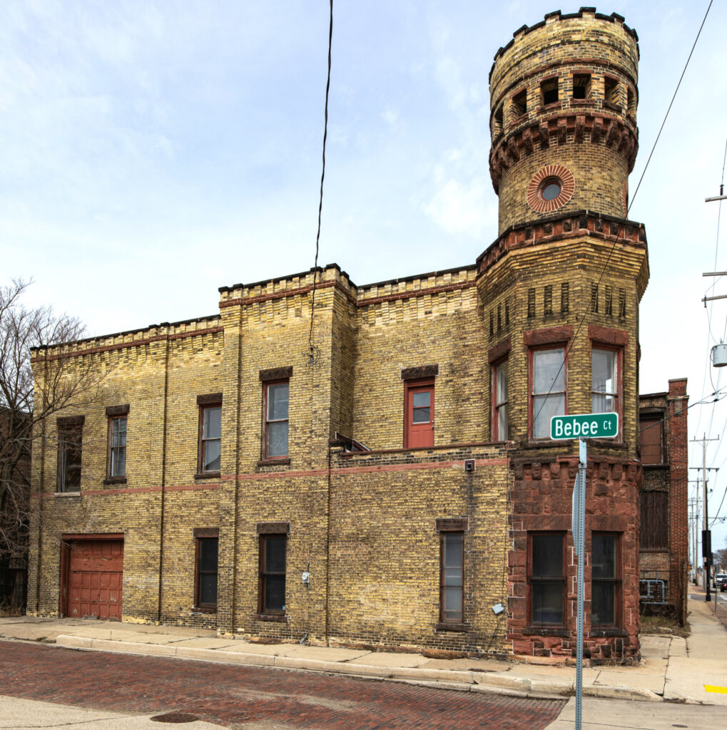 the junction engine house no. 1 at 1412 racine street served as a fire station until 1968. approved for construction in 1894 at a cost of $4,000, it was later purchased by roger olshanski in 1980 before being sold to s.c. johnson. known for its distinctive medieval romanesque revival architecture featuring battlemented parapets and a robust tower, the building resembles a castle and is considered one of racine’s most architecturally unique structures. it was designated a racine landmark on july 21, 1981. (source: robert d. long for the city of racine landmarks commission, “racine’s historic firehouses,” 1982).