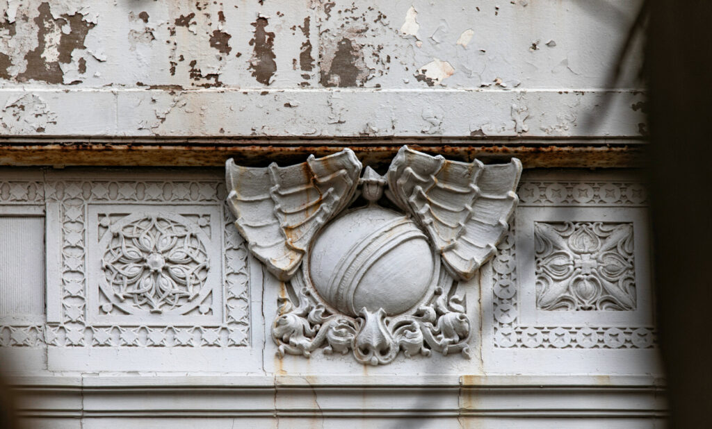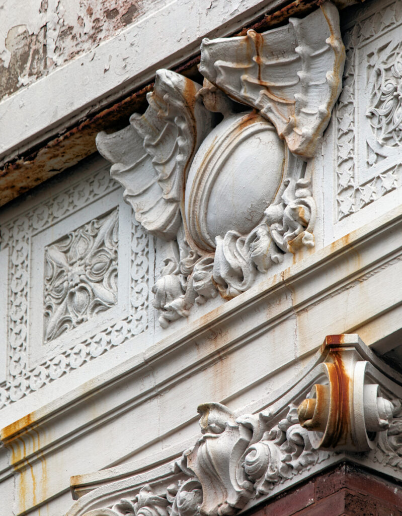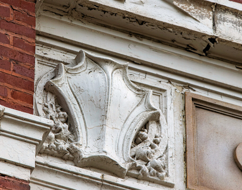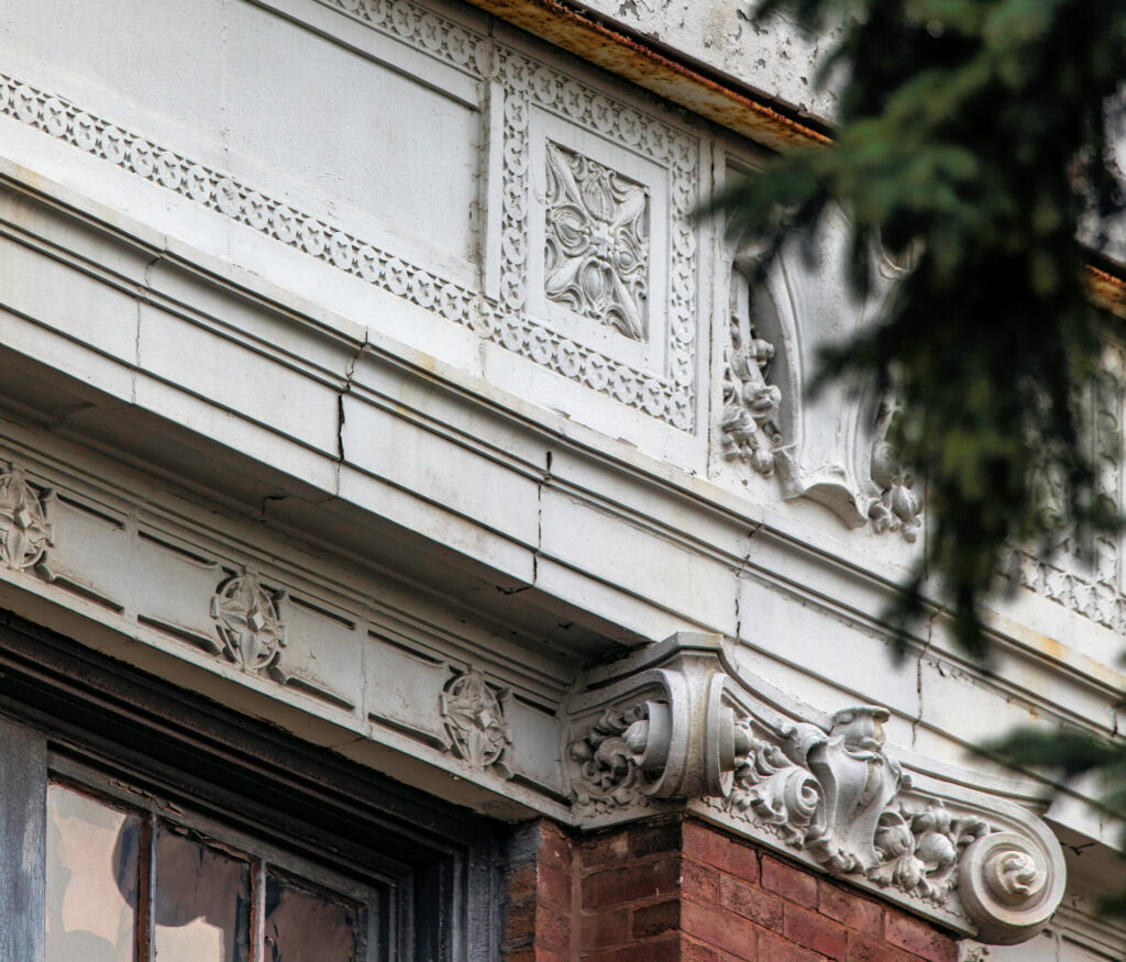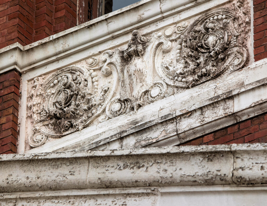 the prairie style administration building features unique cream-colored sullivanesque terra cotta ornament (now painted), was designed by george c. nimmons and executed by the midland terra cotta company, chicago, il.