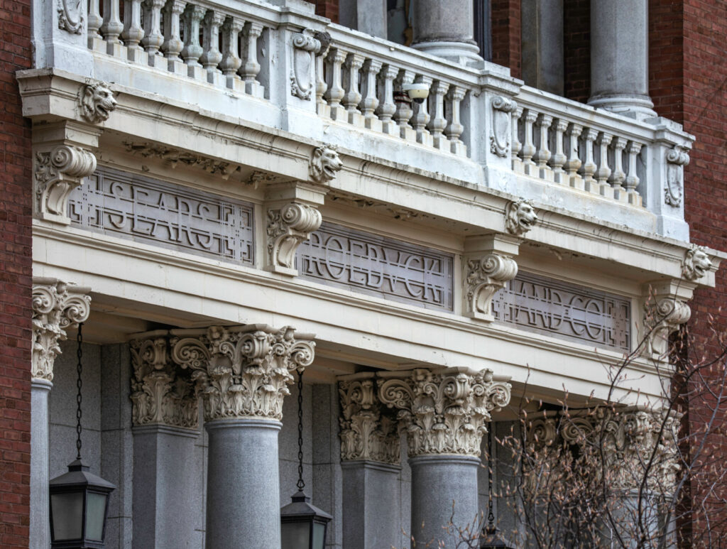 it blends chicago school design with classical and prairie-style touches.