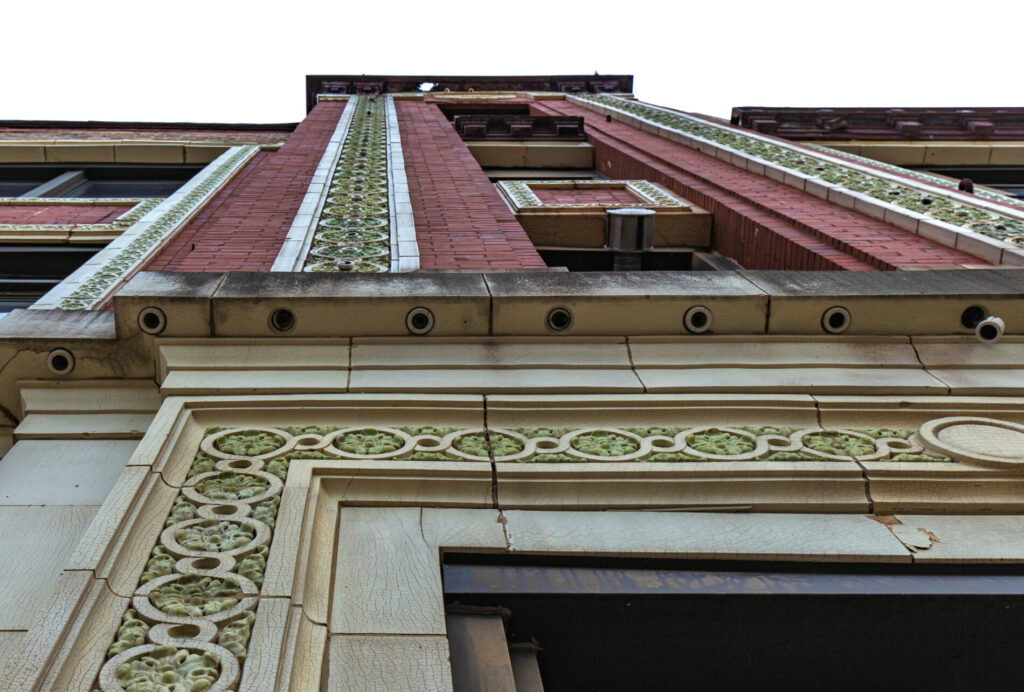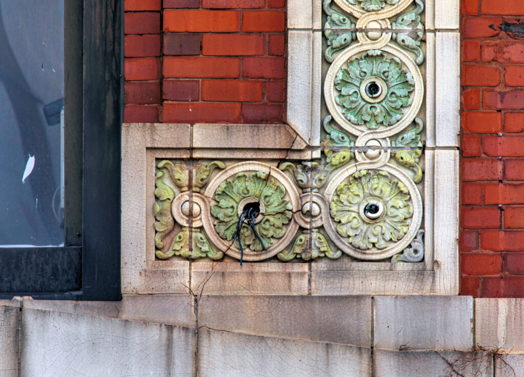 numerous terra cotta panels incorporate bare bulb sockets positioned within central openings, installed by the hub electric company of chicago using concealed conduits. when illuminated by hundreds of incandescent bulbs, the facade presented a striking and sophisticated appearance at night.