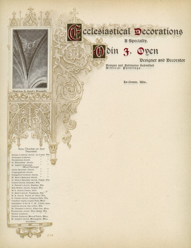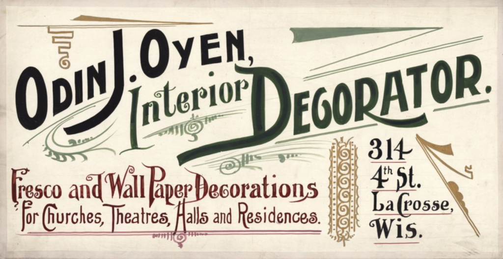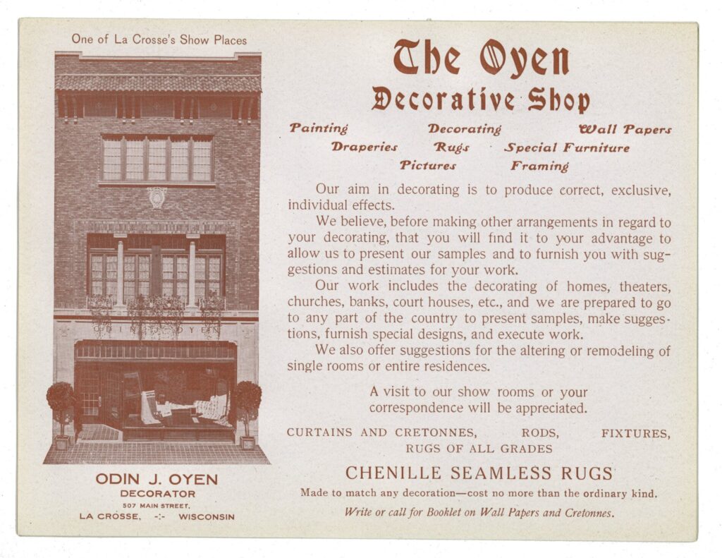 oyen’s decorating business traces its origins to odin j. oyen, who arrived in la crosse, wisconsin in february 1888 at the suggestion of ori sorensen from sorensen and davis contractors. at that time, opportunities for painters and interior decorators in la crosse seemed limitless.