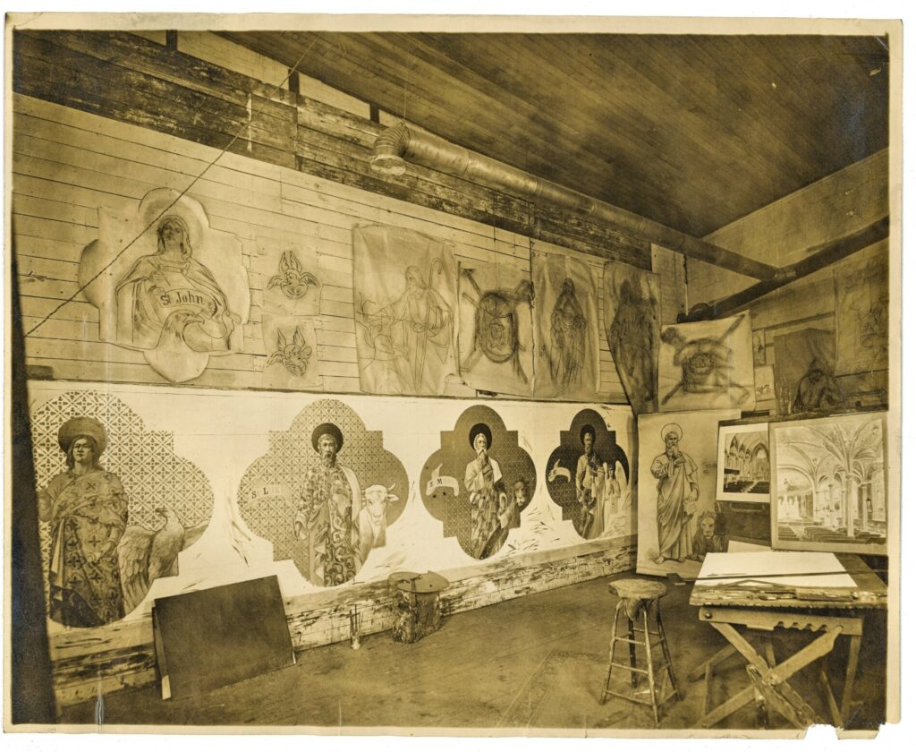 recognizing the demand for a broad client base, oyen quickly began bidding on contracts for public buildings, residences, churches, and movie theaters throughout the upper midwest. as his design firm gained national recognition, oyen shifted focus to managing the business, assembling a talented team of artisans to fulfill commissioned projects. he drew upon the expertise of skilled european artisans who immigrated to america. around 1895, oyen hired joseph erickson—a norwegian-born artist-designer he met in chicago, possibly during the world’s columbian exposition, while working at the fair—as his first full-time staff member. the company’s expansion soon required a larger, more prestigious location.