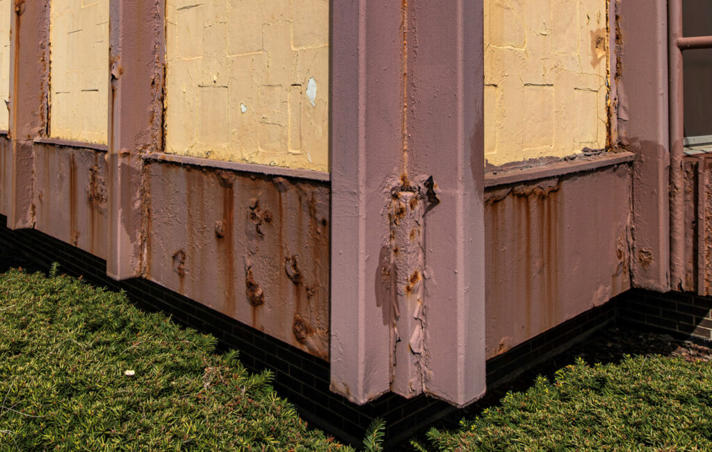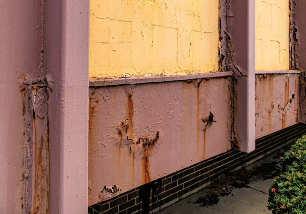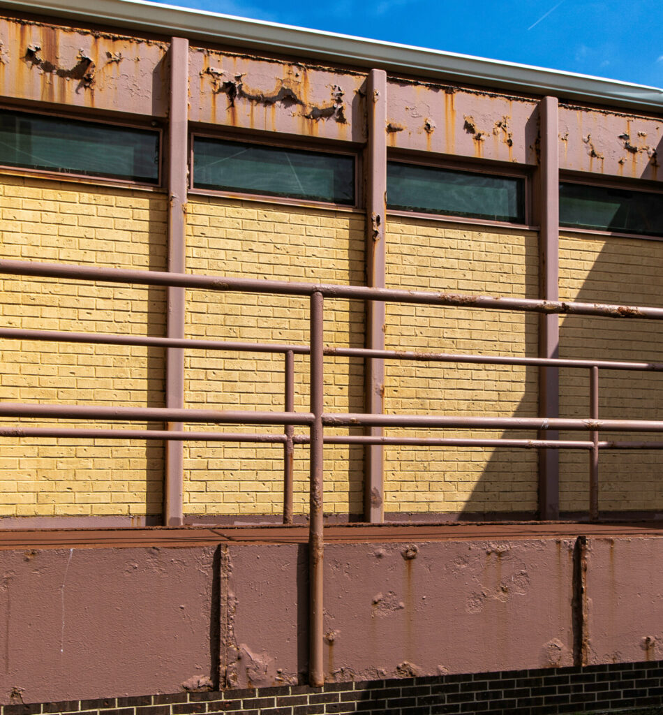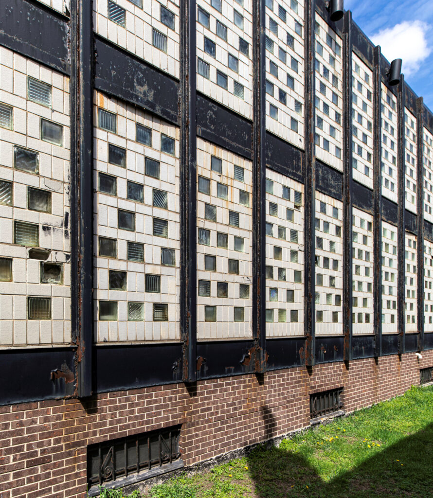 the walls (now painted) between the steel i-beam mullions are comprised of white marble punctuated with single color chunk glass panels.