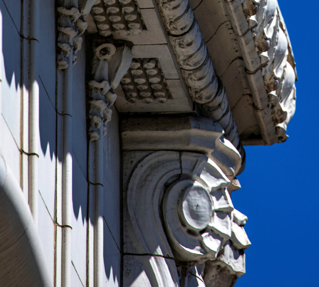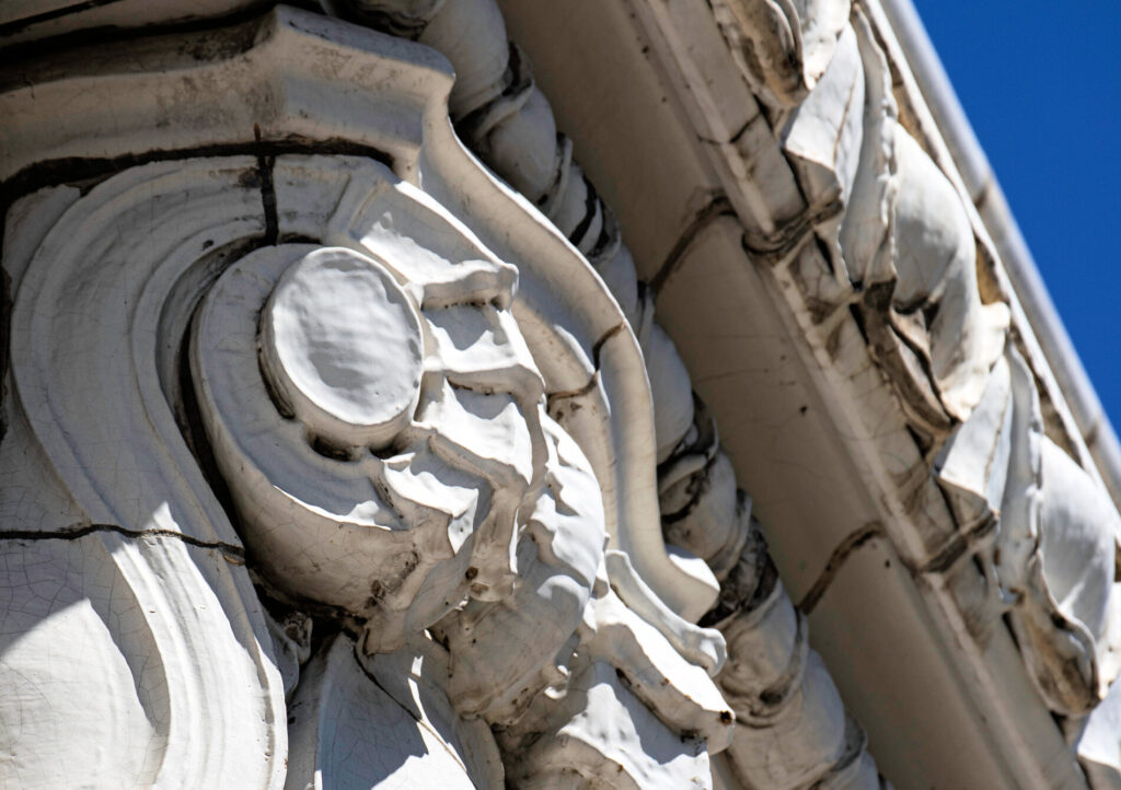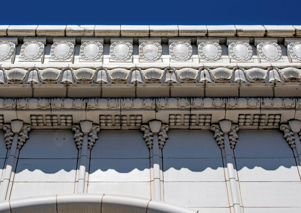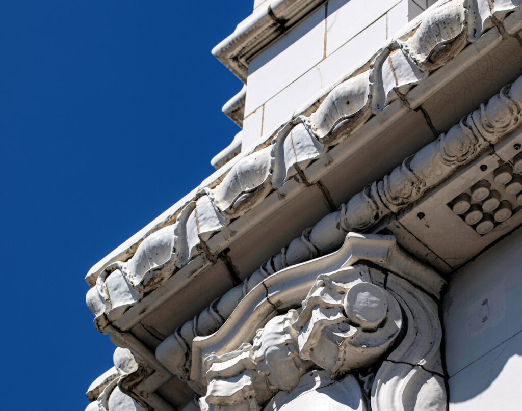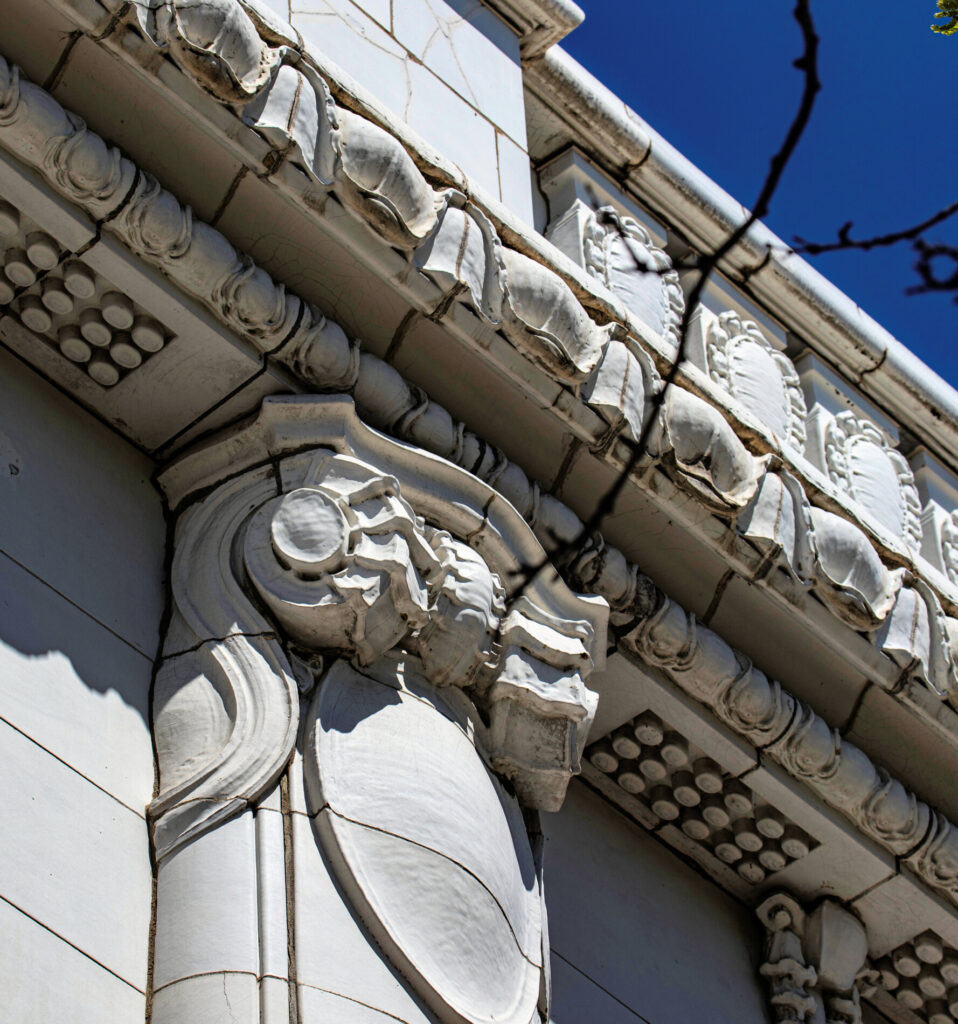 the white glazed terra cotta ornament was fabricated by the northwestern terra cotta company, chicago, il.