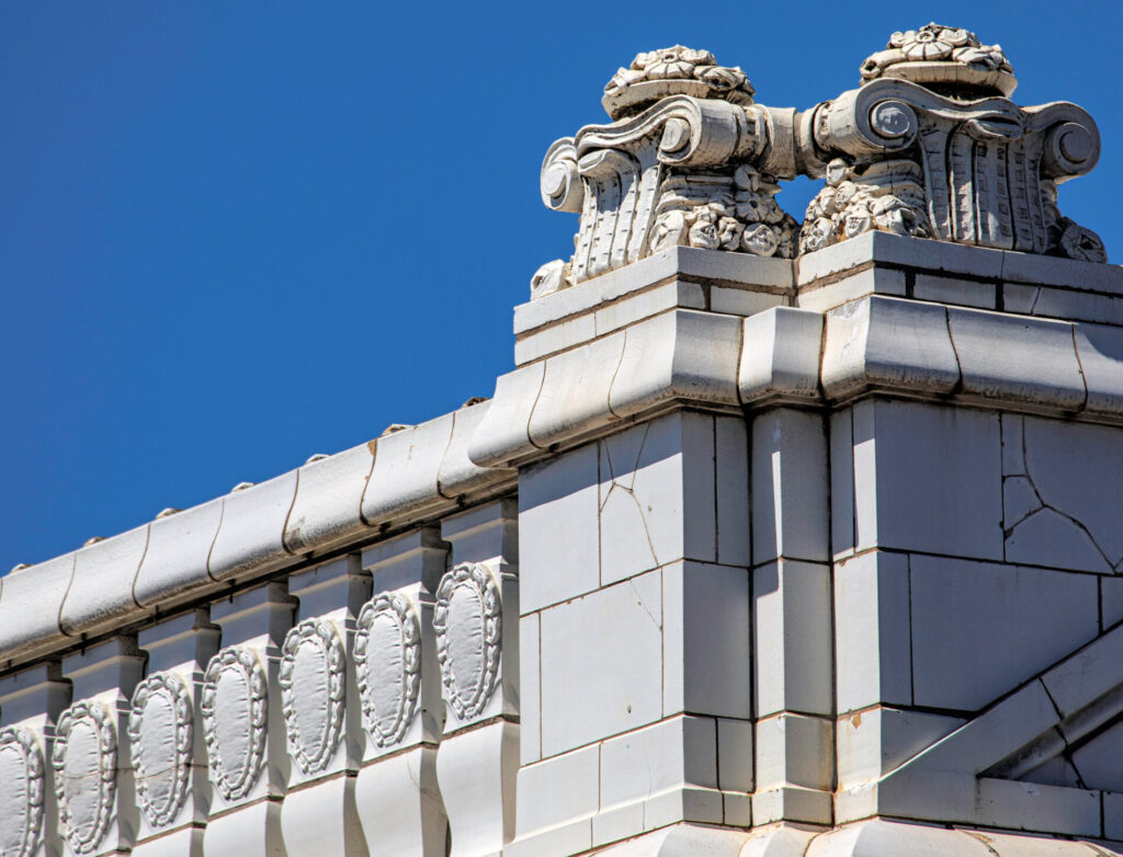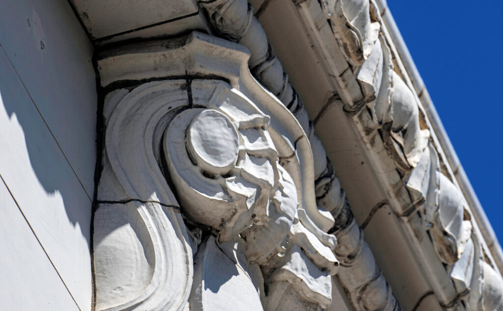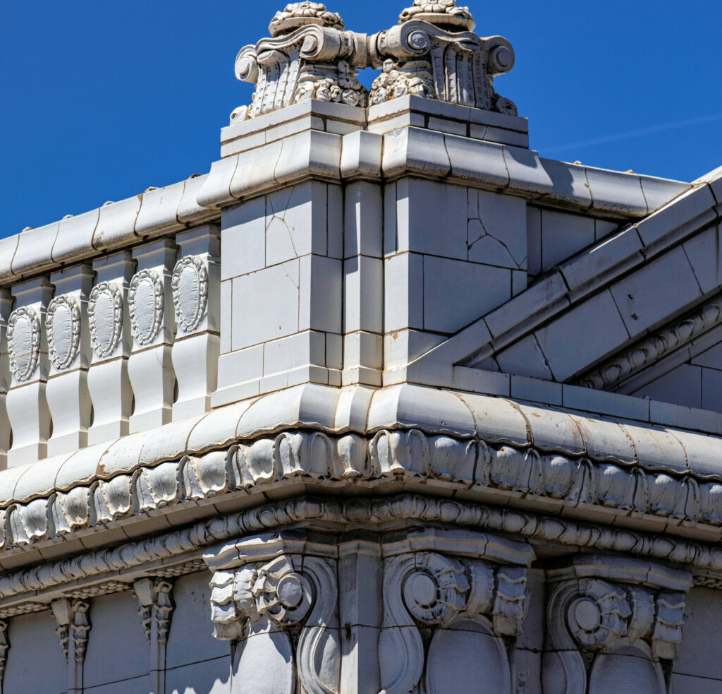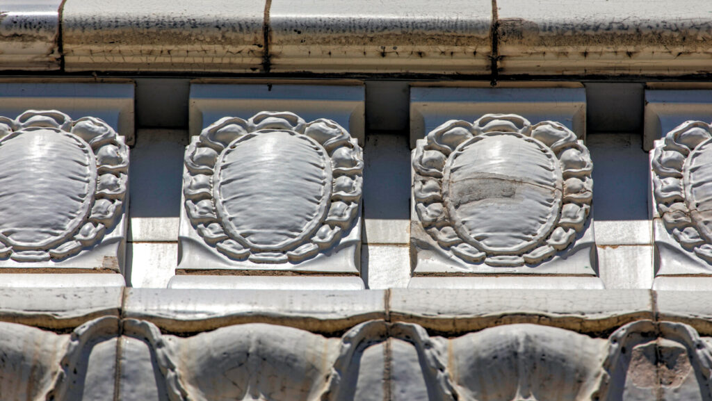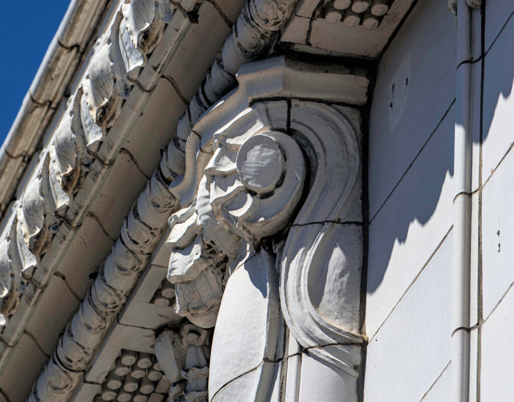 the white glazed terra cotta ornament was fabricated by the northwestern terra cotta company, chicago, il.