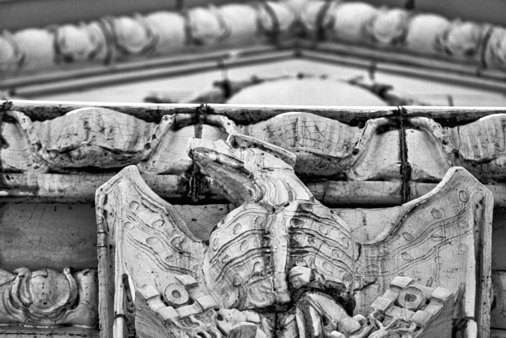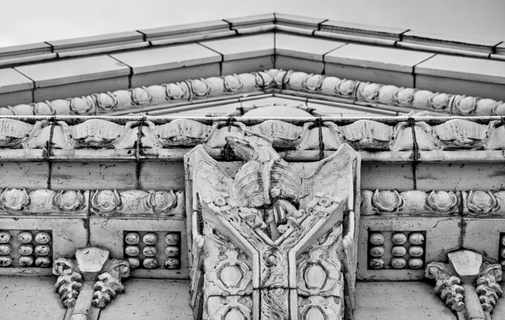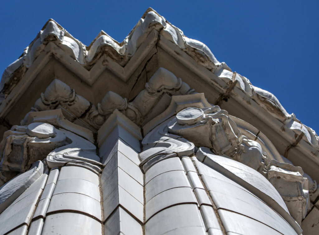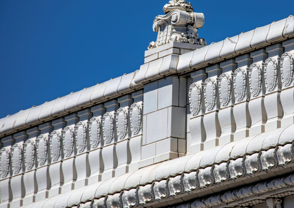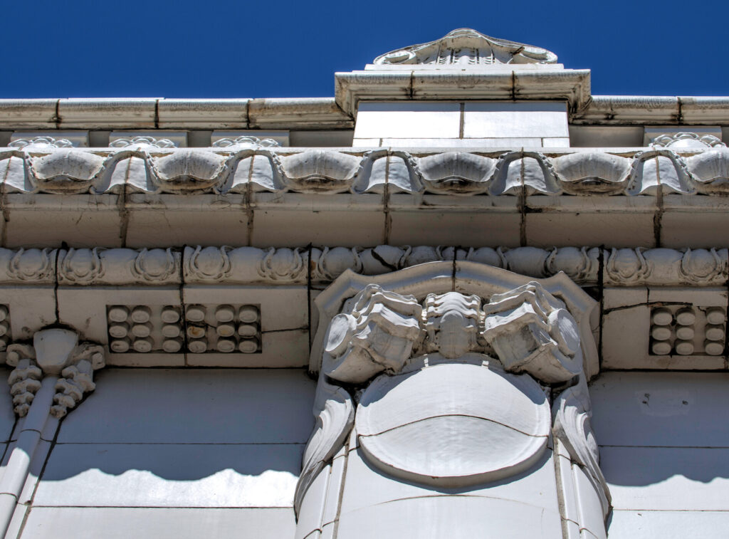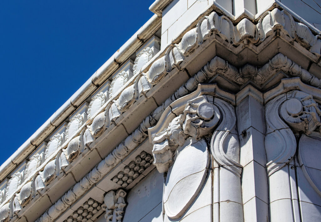 the white glazed terra cotta ornament was fabricated by the northwestern terra cotta company, chicago, il.
