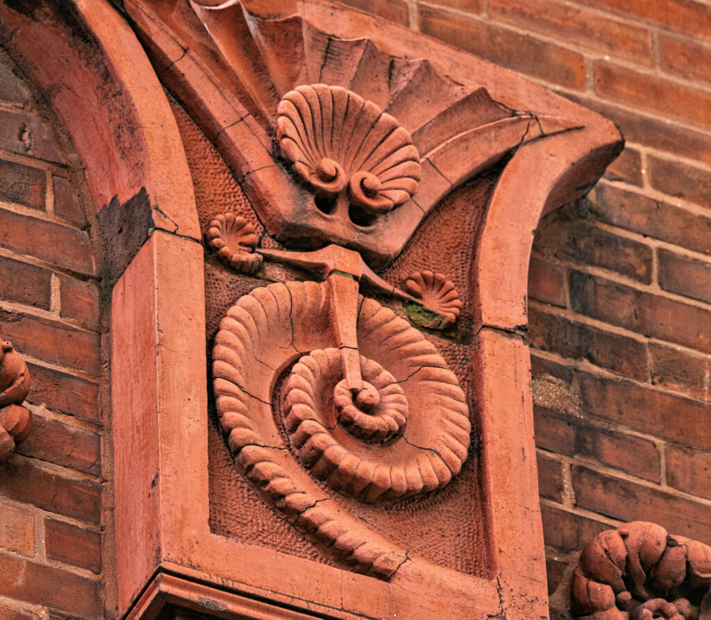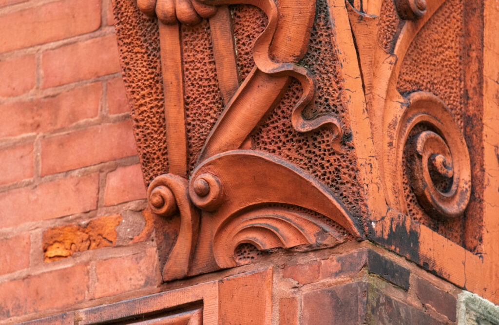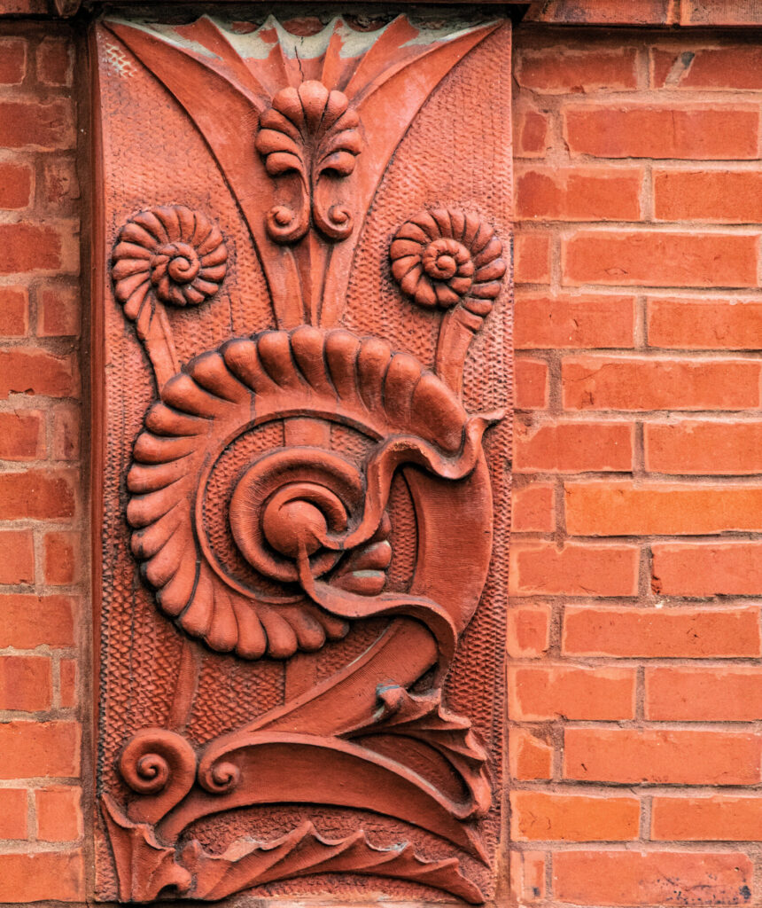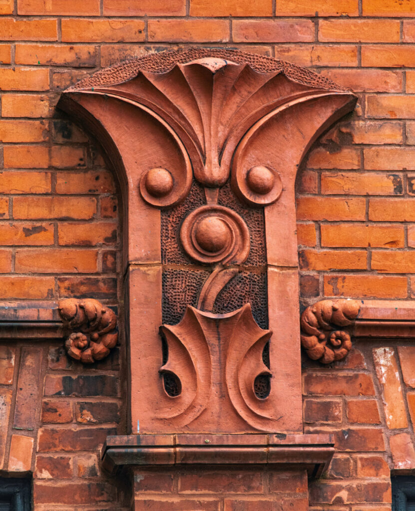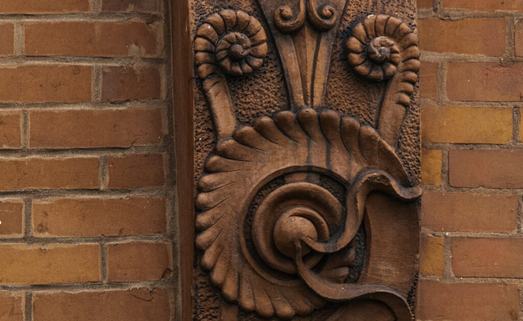 the red slip terra cotta ornament was fabricated by the northwestern terra cotta company, chicago, il.