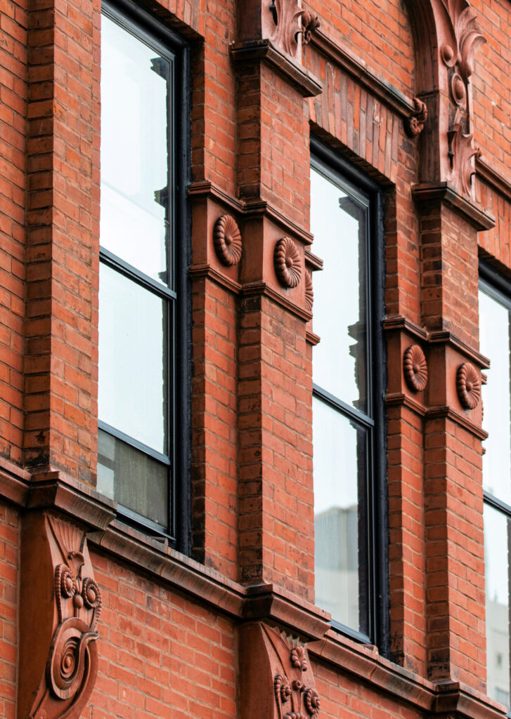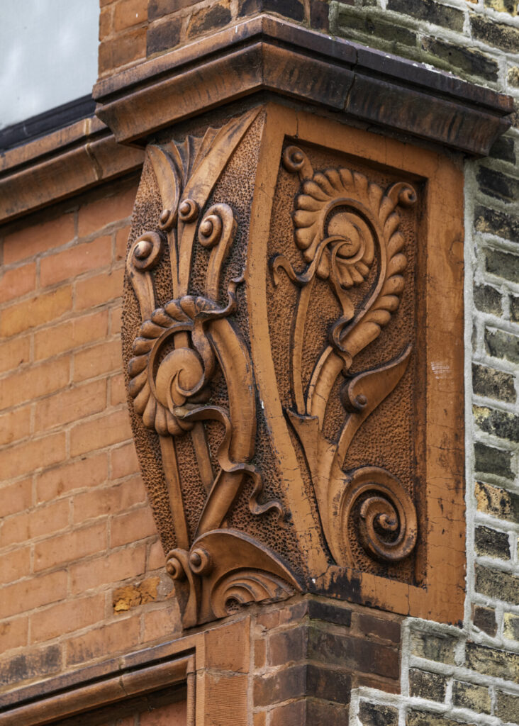 design style: queen anne style with red brick cladding and decorative terra cotta trim.