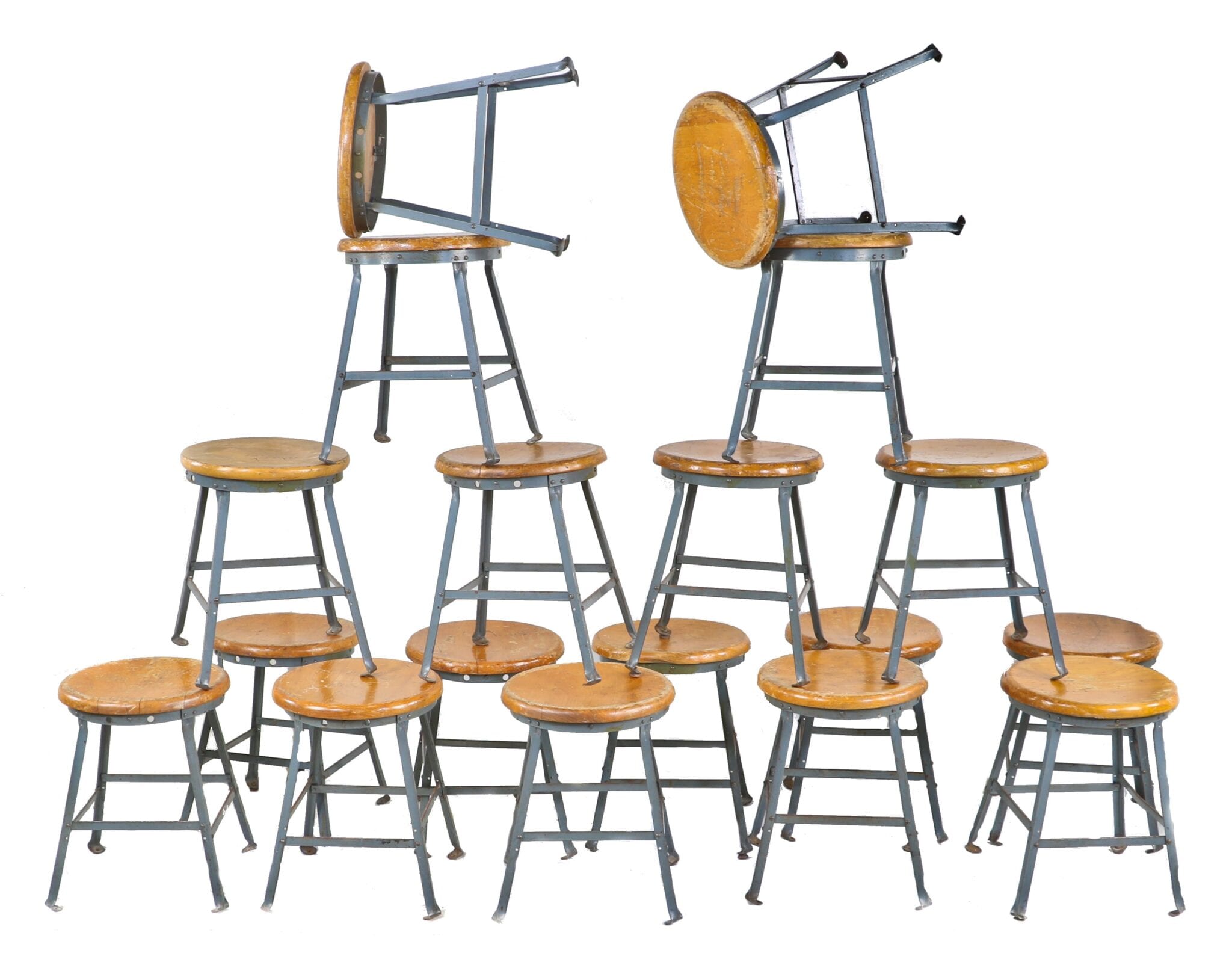 a total of 18 matching all original and completely intact american vintage industrial shop stools were acquired earlier this week. the low-lying stools are identical both in seat type (i.e., solid contoured maple wood) and riveted joint angled steel base configuration. the stools were salvaged from...