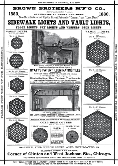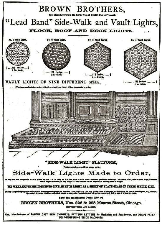 the chicago based brown brother & company founded their vault light business in 1860. by 1873, the well-established company boasted a workforce of 85 men at their factory complex, located at clinton and jackson streets. a year after the great chicago fire, the brown brothers installed two miles of sidewalk and/or vault lights throughout the city.