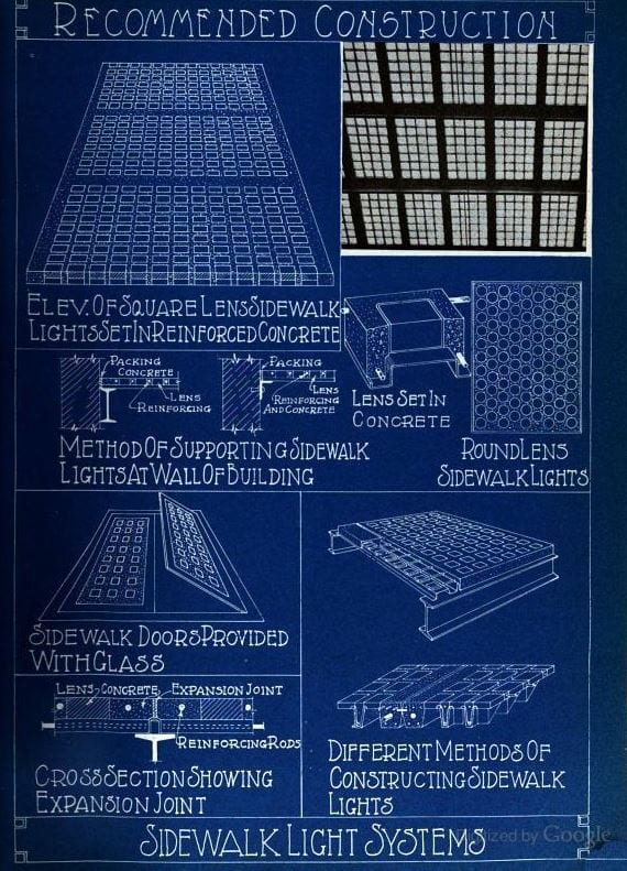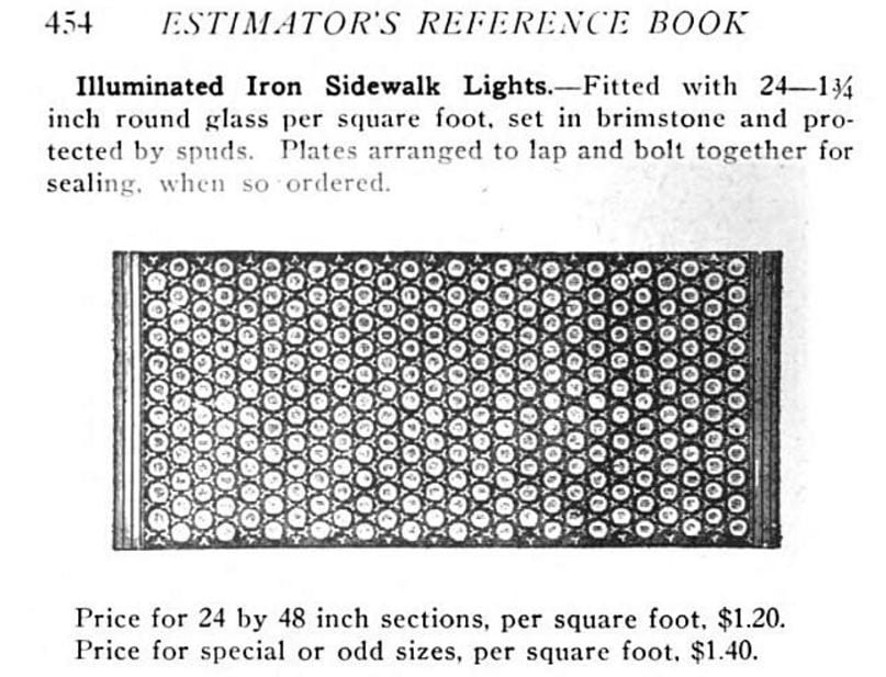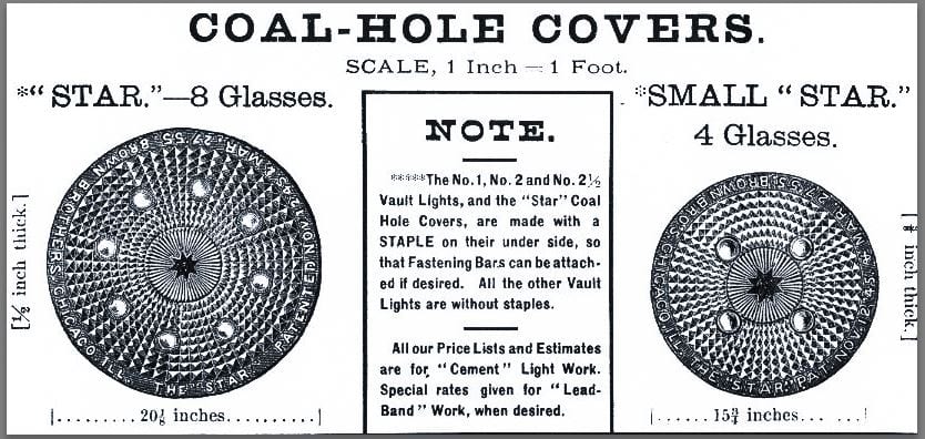 the perforated iron panels containing several closely spaced lenses allowed natural light to illuminate the vaults below during the day. multiple protruding knobs, (arranged in different configurations over the years) were designed to protect the convex-shaped glass lenses from excessive wear and tear. the illuminating covers would become hugely successful in major cities across the country well into the 20th century.