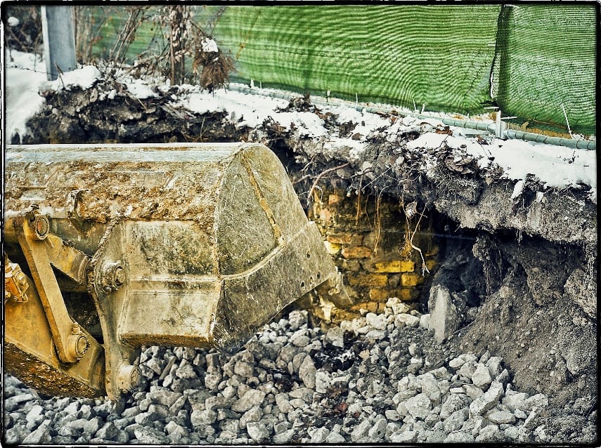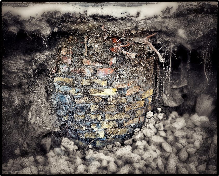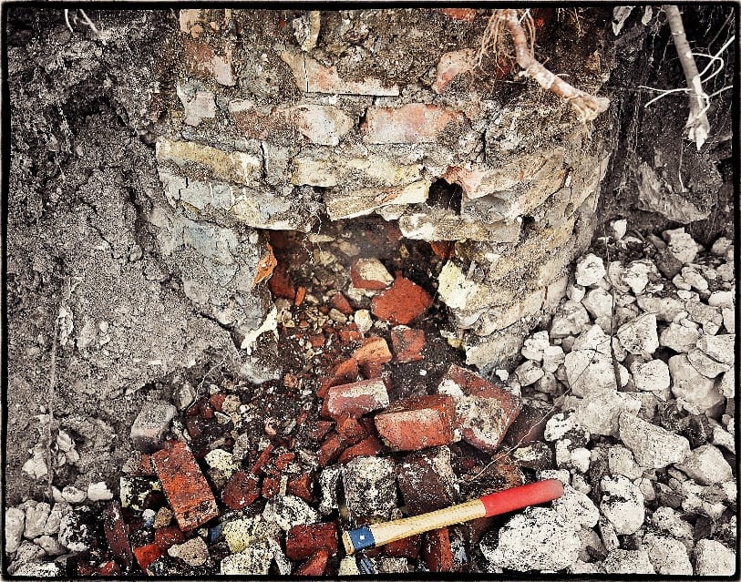 growing desperate perhaps, i decided to spend more time on the third privy, hoping that under the rubble, there might be something of interest. since the day was drawing to a close, darkness was rapidly approaching and my back was in pain from prolonged exposure to the bitter cold, i asked the backhoe operator to “assist” me with opening up this last privy. with the gentle nudge of his bucket, he loosened enough bricks for me to quickly pull apart and gain entrance.