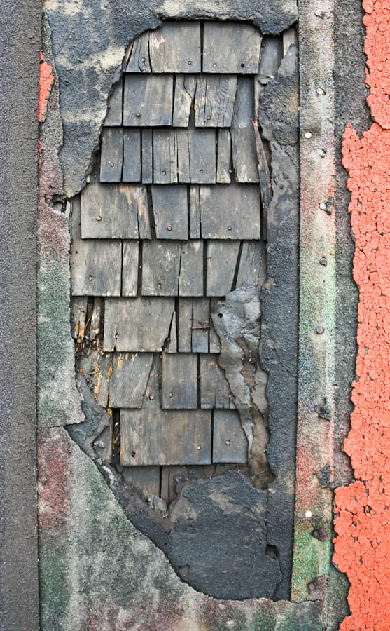 the original one-inch pine wood sheathing had eventually been covered over with lithographed tin advertising when the third addition–an enclosed porch– was added around the turn of the century. these porches are found anchored against nearly every 19th century cottage, constructed between the turn of the century on through the 1930’s. in most cases the original, previously exposed exterior clapboard is left intact, but nearly always painted over. in addition, these boxed-porches contain flat rooftops with a removable hatch allowing access to the heavily pitched roof and/or the attic containing the original rough-sawn rafters, sheathing, and in many cases, original wood shingles buried under rolls of tar paper and asphalt.