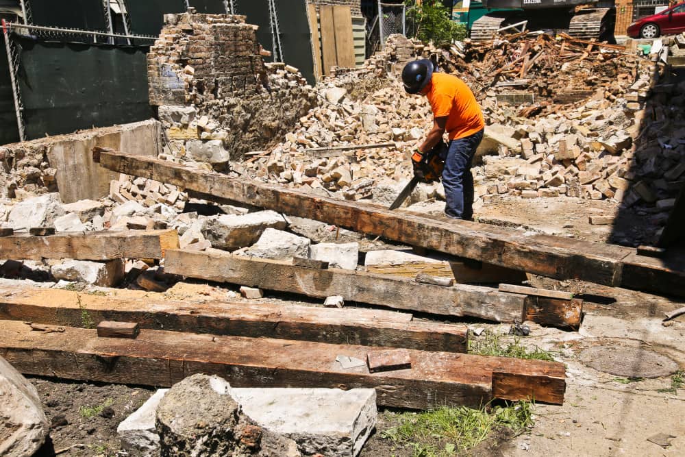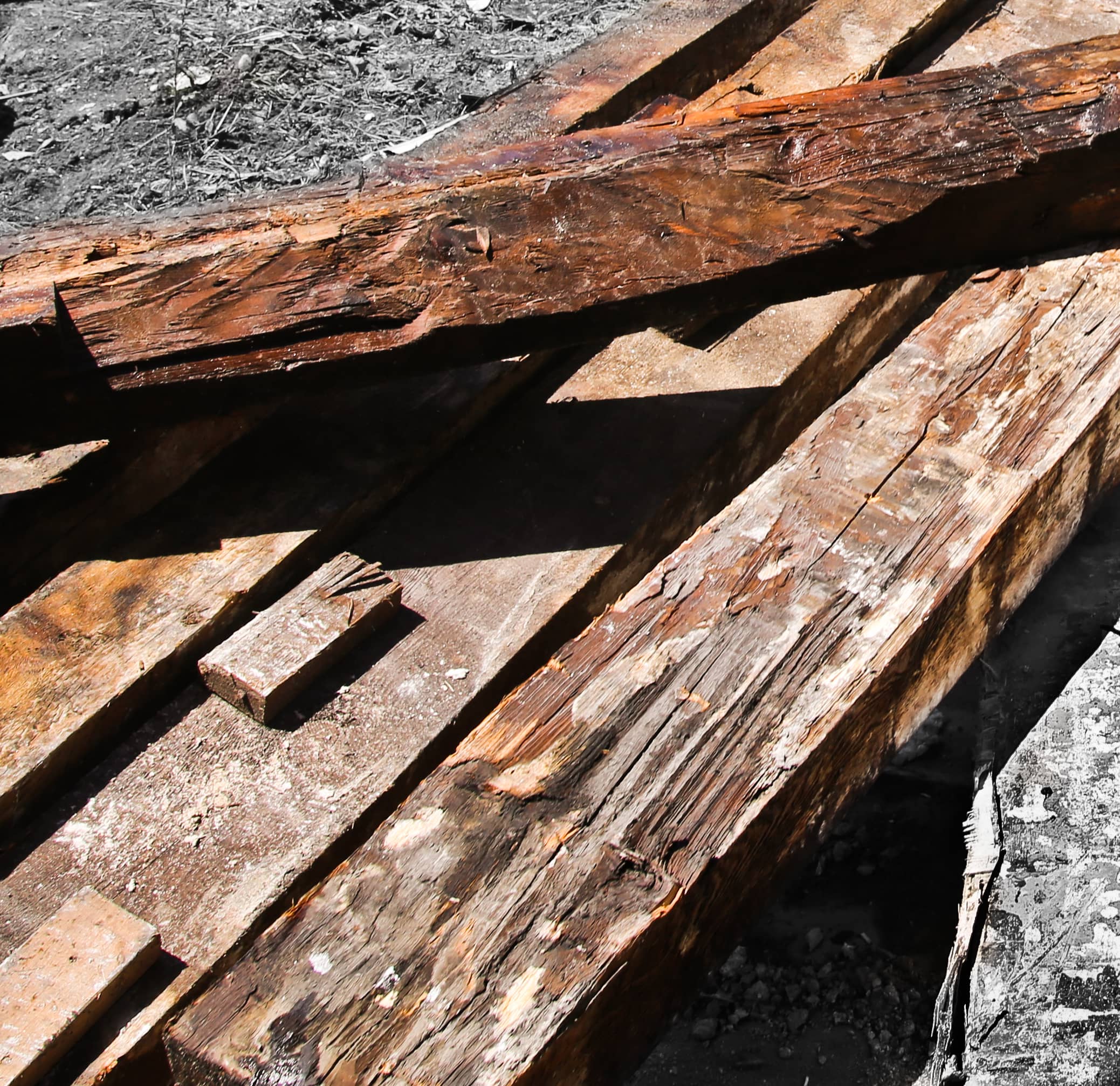 not all was lost, however, as i discovered a collection of partially (or rather single-sided) hewn pine wood beams positioned neatly atop the brick walls, midway between the “garden” apartment and the first floor, located high above street grade.