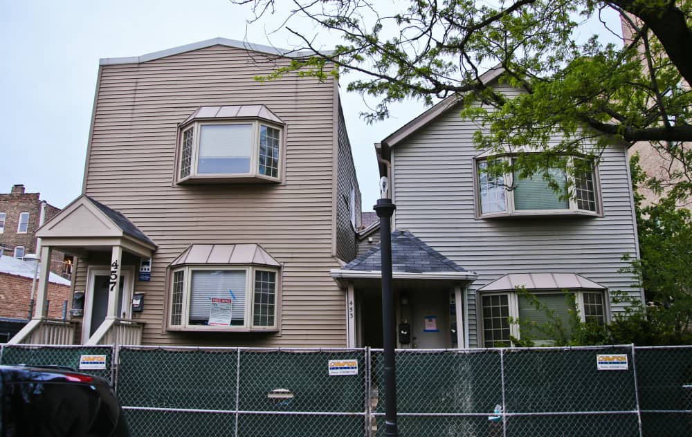 within the past month, demolition commenced and then quickly finished on two wood framed cottages located at 455 and 457 aberdeen street (just west of the site where the john kent russell house once stood) in west town. since the excavated lots have been emptied of wrecking crew and salvager alike, there is little to keep them from passing away in public memory. the structurally important residences which date to chicago’s “pioneer days” would have been among the oldest surviving cottages in the city based on existing data.