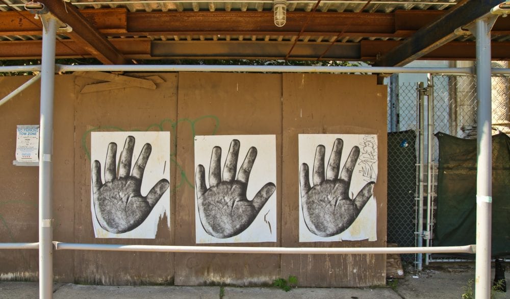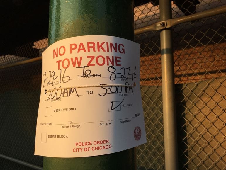 during the shoot, i couldn’t help but notice sticker art graffiti plastered along the fence, including a “halting hand” symbol which seemed to fit the situation quite perfectly. other than kamin and myself, there were no wreckers or machines to be found, but the ominous green fence wrapped around the building was a clear indicator that death is highly likely. in fact, as i was leaving a man from the chicago streets and sanitation department arrived to post no parking signs on the lamp poles surrounding the church. the “no parking” period begins july 29th through august 27th, from 7am to 5pm, which to me represents the span of time it will take to reduce a historically important structure to rubble. as the signs were being posted and i drove away, kamin went to speak with the man, perhaps gathering additional information on an outcome i’m all too familiar with. of course i could be wrong, but i’m nevertheless prepared to set up camp there to document its death.