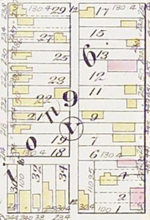 preliminary research was done shortly before posting this entry in order to obtain the most accurate build date since the beer bottle left by a tradesmen involved in building the structure was distributed over the course of several years. an 1886 sanborn insurance map shows the lot as being underdeveloped – surrounded by one and two-story wood-frame cottages that were likely built during the 1860’s-1880’s. by the early 1890’s the wood cottages were being replaced with larger masonry or brick boarding houses designed to accommodate more tenants. building records and city directories indicate that the recently demolished structure was built between 1889-1893.