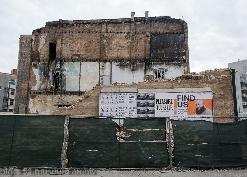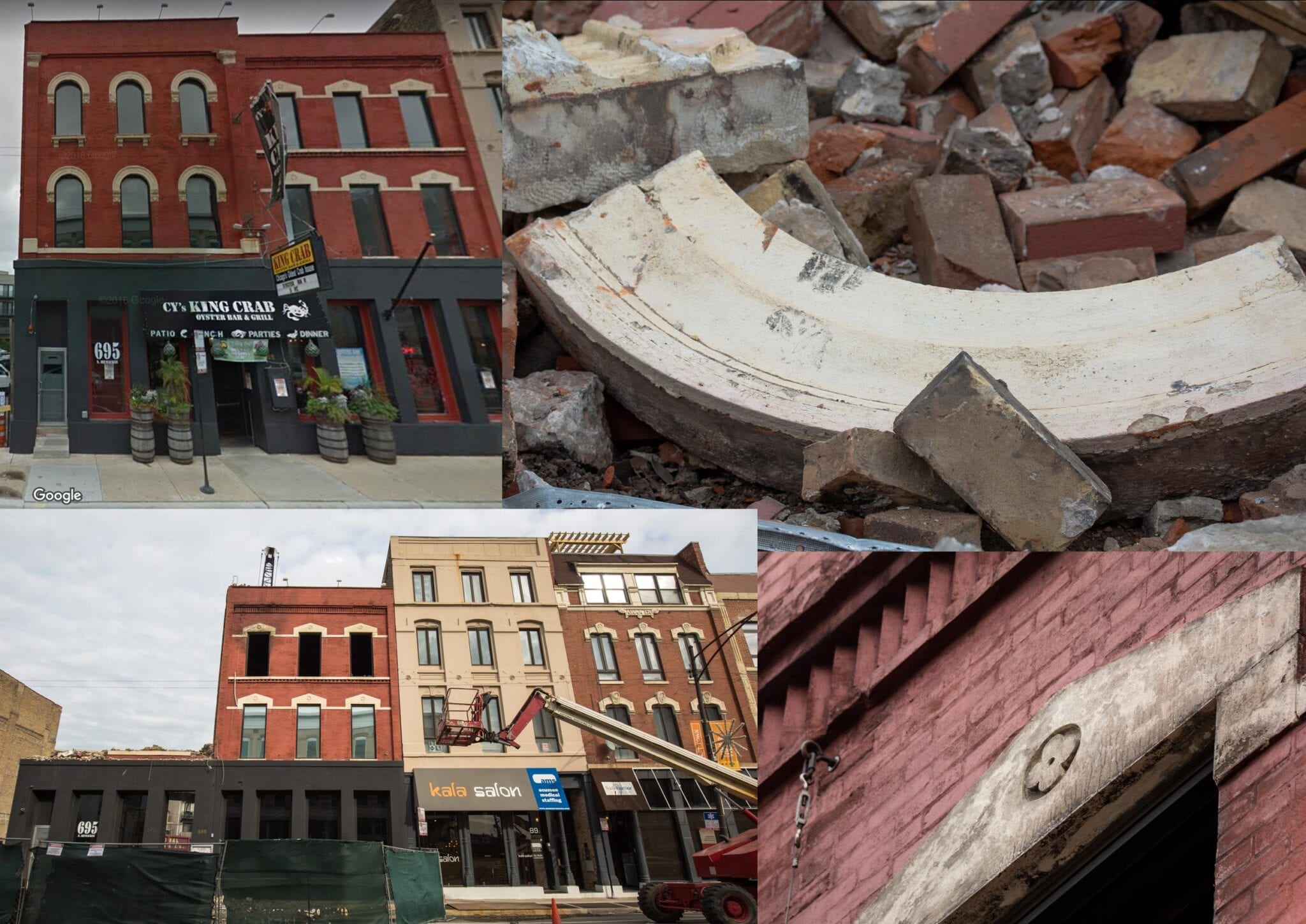 at this point, kling’s building is half-demolished. the lemont limestone circle-top window hoods adorning the facade came crashing down – a complete loss.