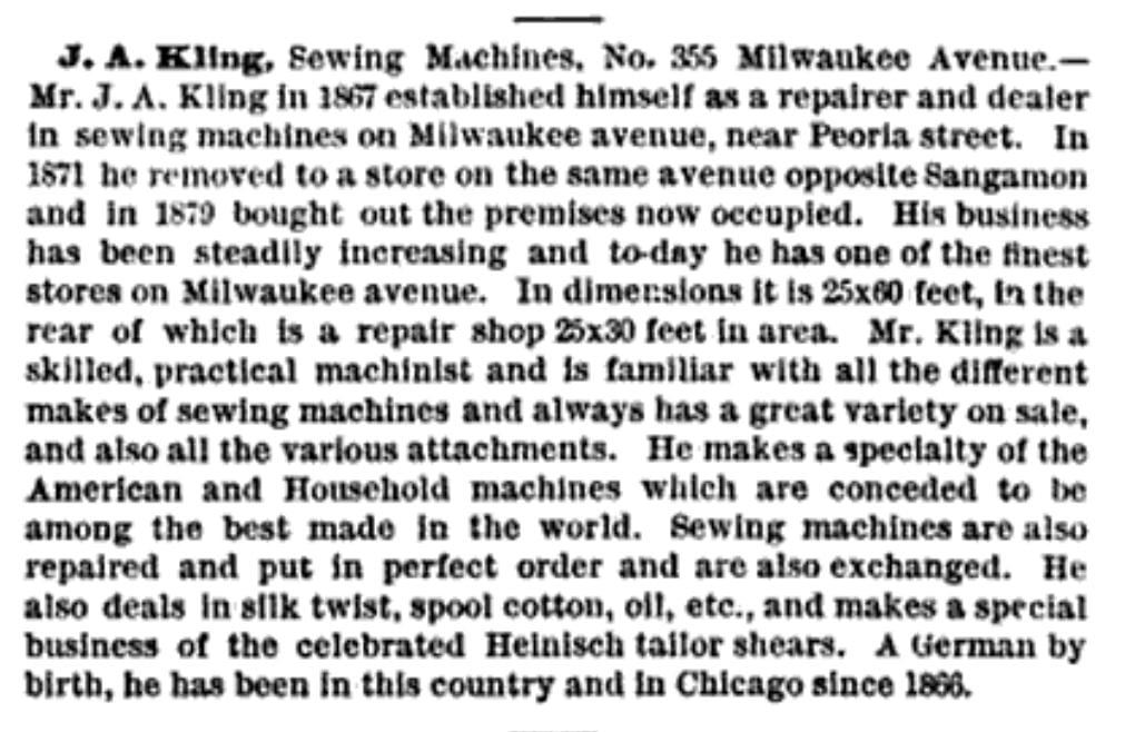 his initial location as a repairer and dealer in sewing machines was also on milwaukee avenue, near peoria street. in 1871 he moved to the 355 location on the same avenue, and in 1879 bought out the premises he now occupied. according to the 1887 publication half century’s progress of the city of chicago: “his business has been steadily increasing and today he has one of the finest stores on milwaukee avenue. in dimensions it is 25×60 feet, and in the rear of which is a repair shop 25×30 feet in area. mr. kling is a skilled, practical machinist and is familiar with all the different makes of sewing machines and always has a great variety on sale, and also all the various attachments. he makes a specialty of the american and household machines which are conceded to be among the best made in the world. sewing machines are also repaired and put in perfect order and are also exchanged. he also deals in silk twist, spool cotton, oil, etc., and makes a special business of the celebrated heinisch tailor shears.”
