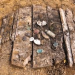 additional images of the privy floor with scattered remnants and a lightly cleaned and sanded section of one of the boards taken from the privy floor.