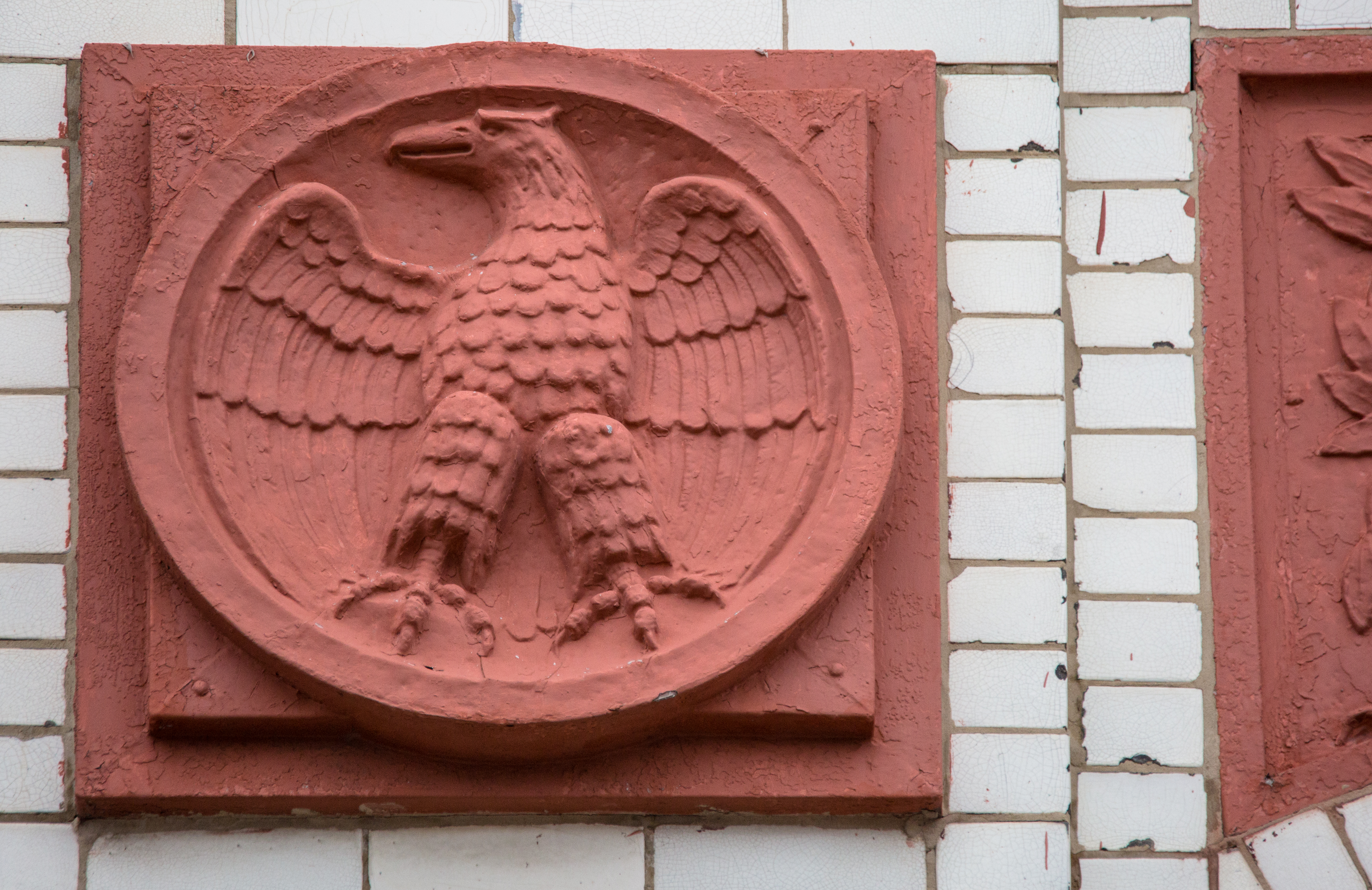 at first i thought the ornament, including the eagles were comprised of terra cotta or possibly limestone. after closer inspection, any and all of the red-painted ornament is comprised of galvanized tin against glazed white face brick.