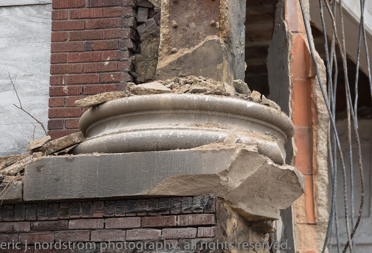 the fate of the name plaques or tablets is not known. i hope they are being saved. there hasn’t been any visible evidence of their destruction based on a thorough search in the piles of stone and twisted iron. i finally spoke with the owner, who at the time, was operating one of the excavators. he is certainly sympathetic to salvaging ornament to a degree. in fact, there was a capital column fragment i found in the rubble i purchased from him that i brought back to my shop to study the materials/methods.