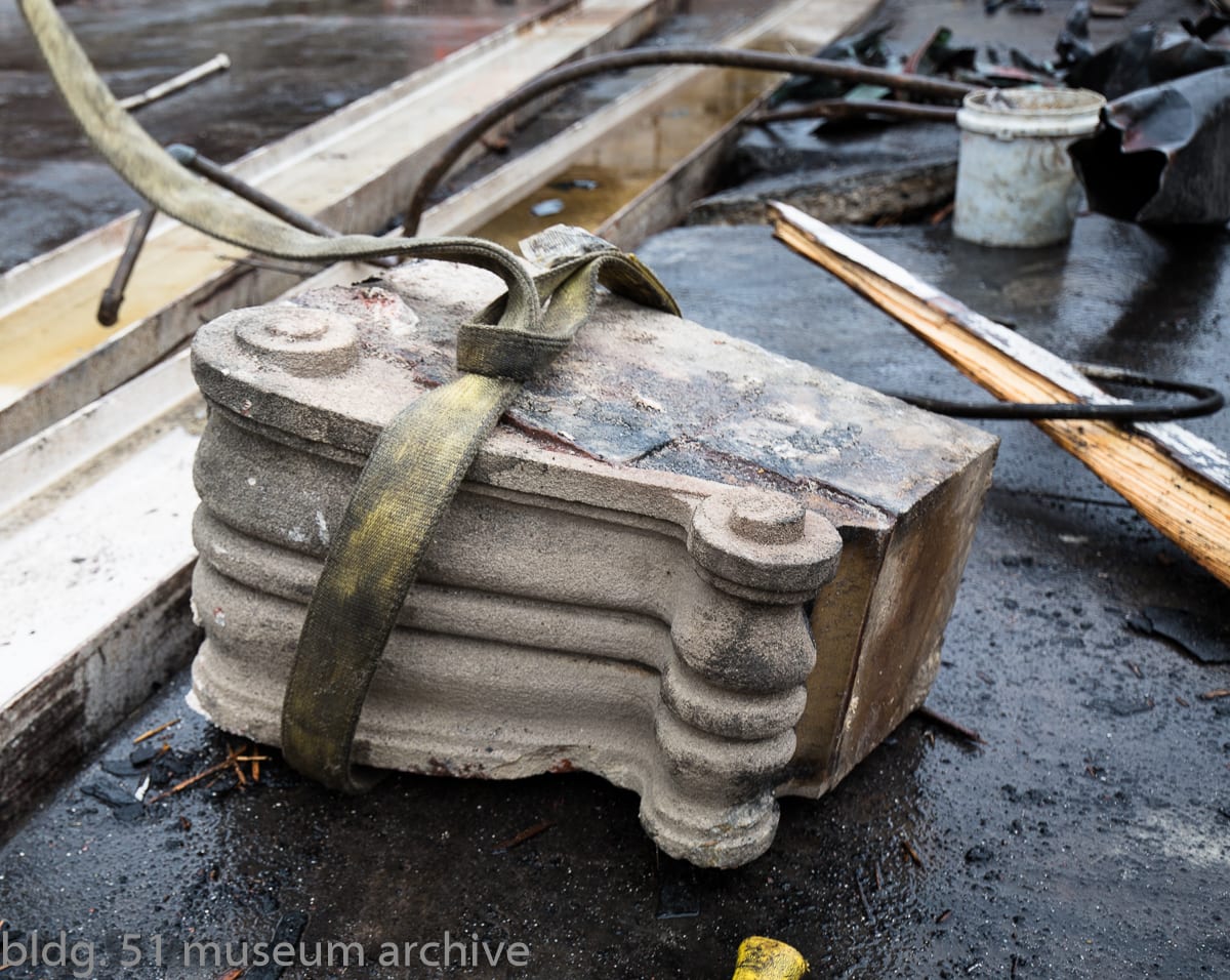 final moments of the former auto service company (later carbit paints) building. the two oversized indiana limestone keystones with volutes were salvaged for the developer.