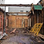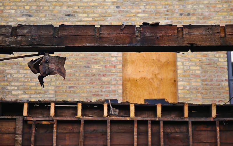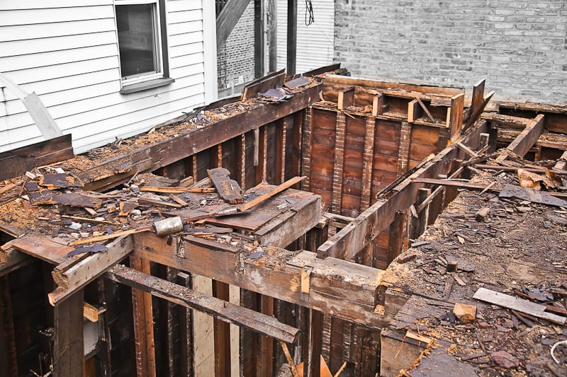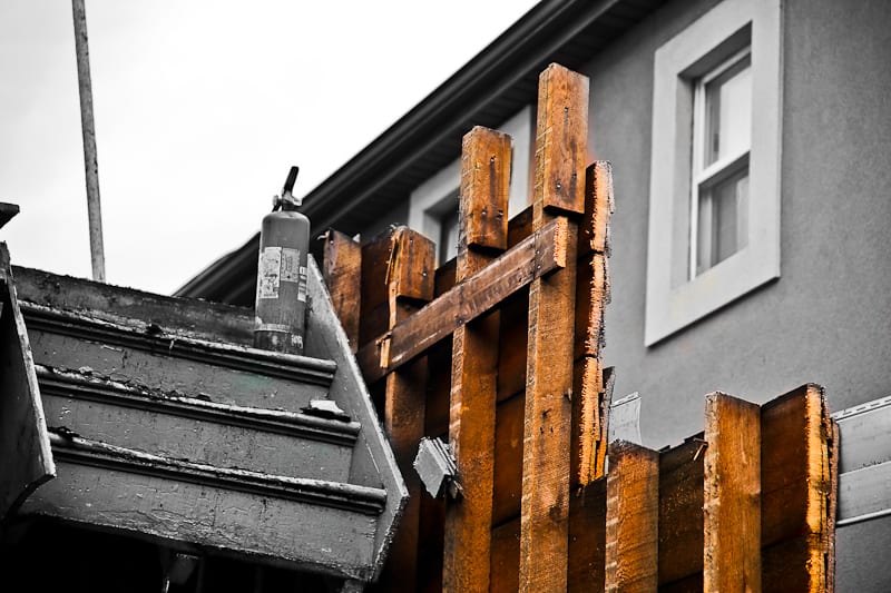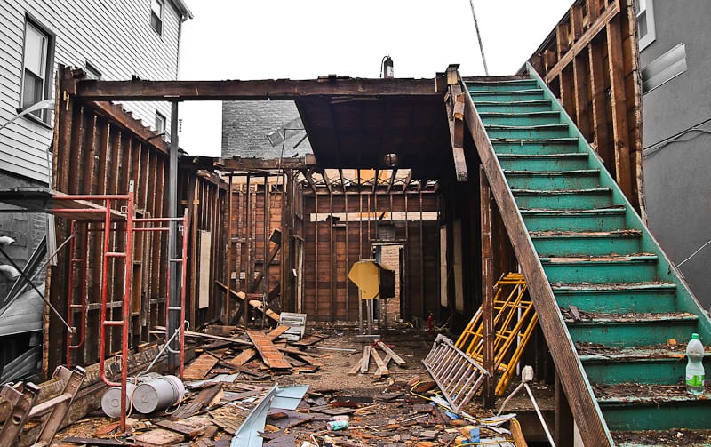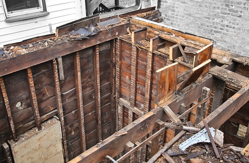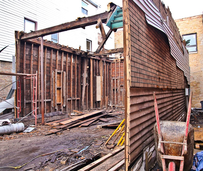while en route to a demolition in the wicker park neighborhood of chicago, i came across an unusual renovation or demolition, some kind of chaotic project that left the structural components of a 19th century two-story framed cottage fully exposed for both the eye and camera to ponder. after speaking with the “wreckers,” it was made clear that the remaining frame would be taken apart – by hand – and all of the wood carted off to the dump. tabling concern for the latter, i received permission to document what remained of the structure, including several integrated “systems” that were still intact.